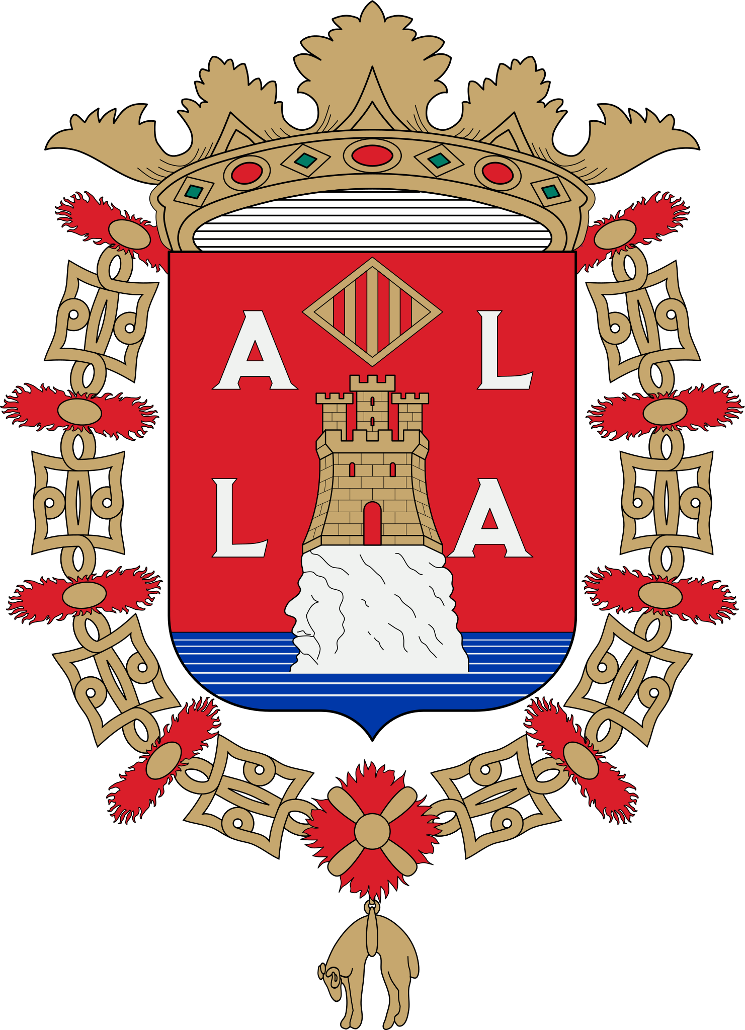 - En campo de gules, bajo las barras de Aragón, un castillo dorado sobre una roca batida por el mar. Encuadrando el fuerte, las iniciales A.L.L.A. Y fuera del blasón, sirviéndole de timbre y orla, respectivamente, un coronel abierto y el Toisón de Oro.