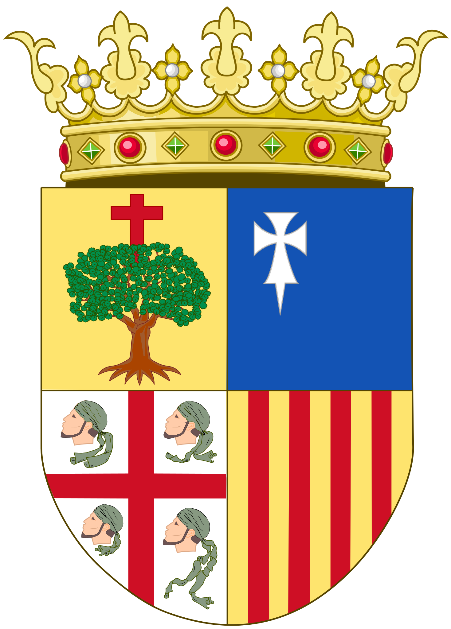 - Escudo cuartelado en cruz: Primer cuartel, sobre campo de oro, una encina desarraigada, con siete raigones, en sus colores naturales, coronada por cruz latina cortada y de gules. Segundo, sobre campo de azul, cruz patada de plata, apuntada en el brazo inferior y adiestrada en el cantón del jefe. Tercero, sobre campo de plata, una cruz de San Jorge, de gules, cantonada de cuatro cabezas de moro, de sable y encintadas de plata. Cuarto, sobre campo de oro, cuatro palos gules iguales entre sí y a los espacios del campo. Todo el escudo, timbrado de corona real abierta de ocho florones, cuatro de ellos visibles, con perlas, y ocho flores de lis, cinco visibles, con rubíes y esmeraldas en el aro, en proporción con el escudo de dos y medio a seis.