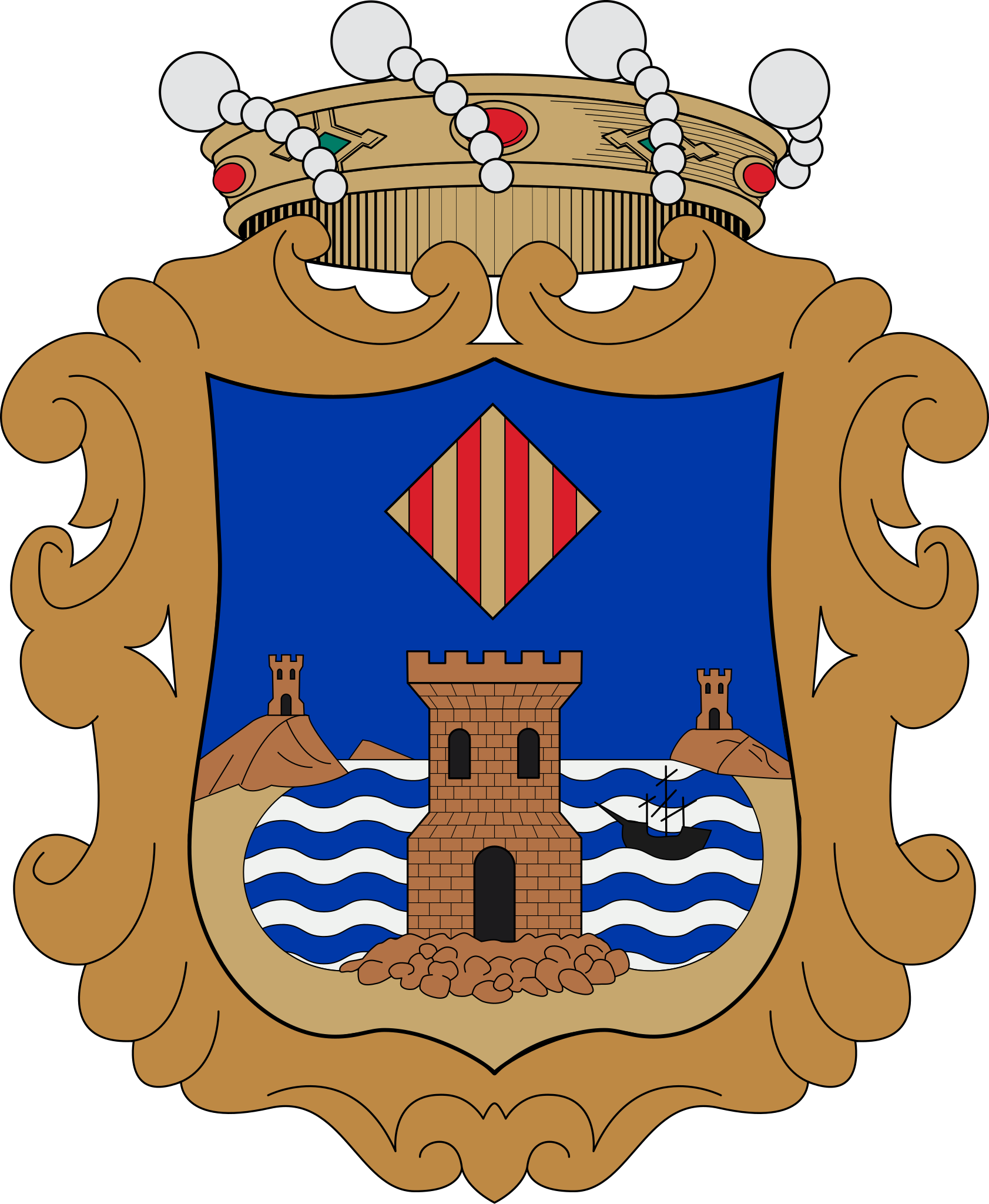 Escudo de Benidorm, Marina Baixa (País Valenciano): En campo de azur, una torre de piedra aclarada de sable, aterrazada de una especie de playa que se prolonga por los flancos formando una bahía, con una torre en cada extremo; mar y en la diestra, un montículo en forma de islote; la torre principal está superada de un escudo de dama de oro con cuatro palos de gules: Corona de barón.
