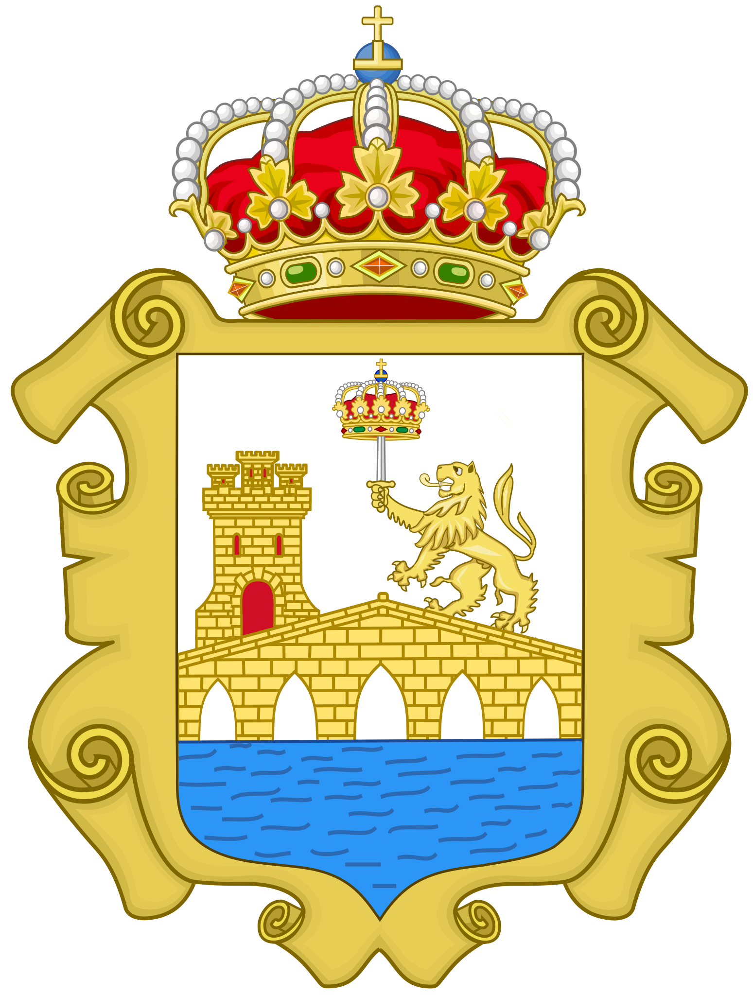 Escudo de la ciudad de Ourense: En campo de plata, sobre ondas de azur y plata, un puente de cinco arcos, de oro, sumado a su diestra de un castillo, también de oro, almenado, mazonado de sable y aclarado de gules, y en su siniestra de un león rampante, de oro, sosteniendo en su diestra una espada, del mismo metal, y en el centro del jefe una corona real cerrada.