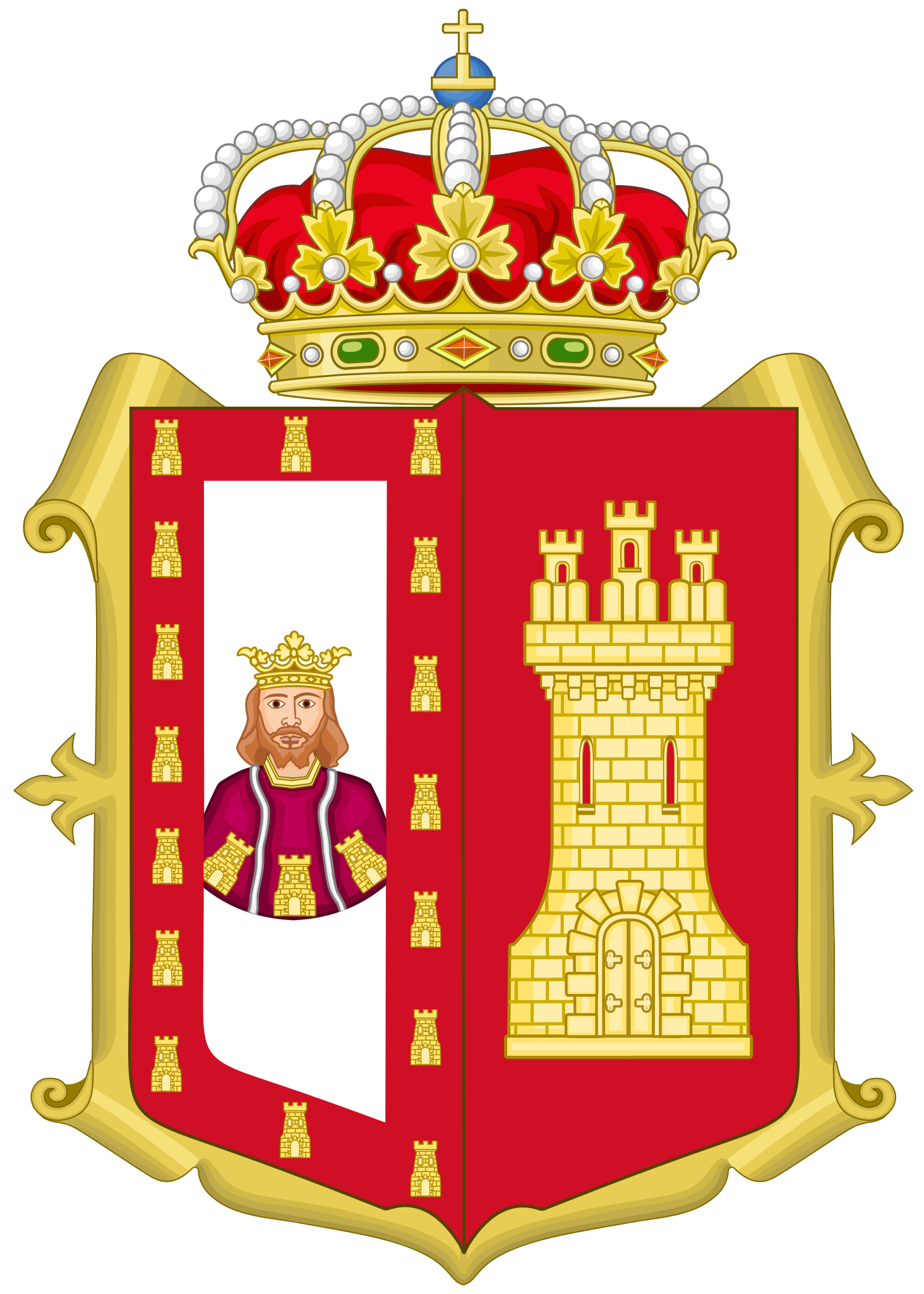 - Primer cuartel (izquierda del portador, derecha del espectador): En campo de plata (blanco), aparece el busto de un rey coronado de oro, con rostro de carnación y vestido con una dalmática roja (gules) que lleva tres castillos de oro. Este busto representa a un monarca castellano y simboliza la importancia histórica de Burgos como sede de la corte castellana.
