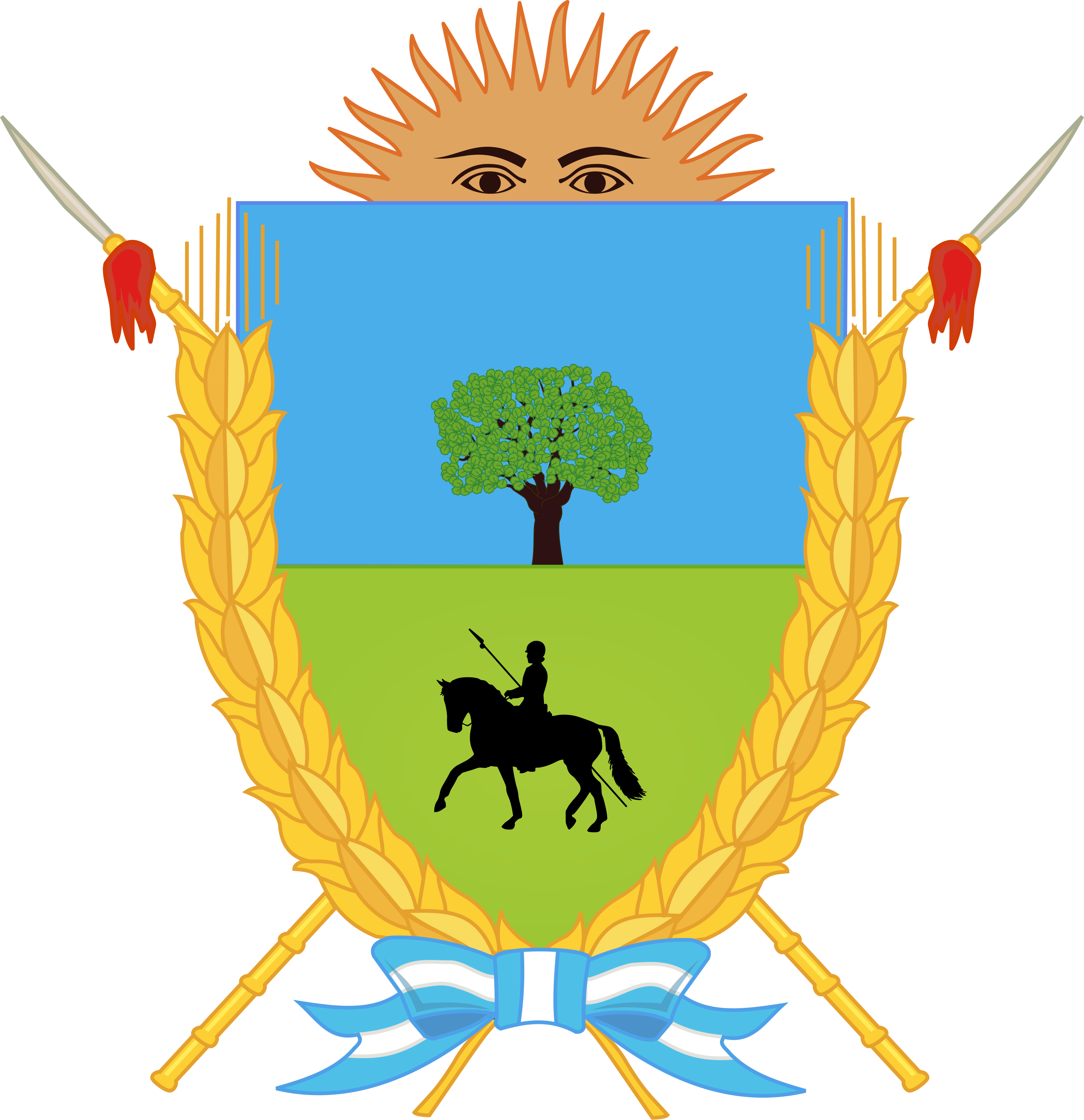 - Lanzas Pampas: Aparecen cruzadas por detrás del escudo en memoria del espíritu guerrero del indígena y la defensa de sus tierras.