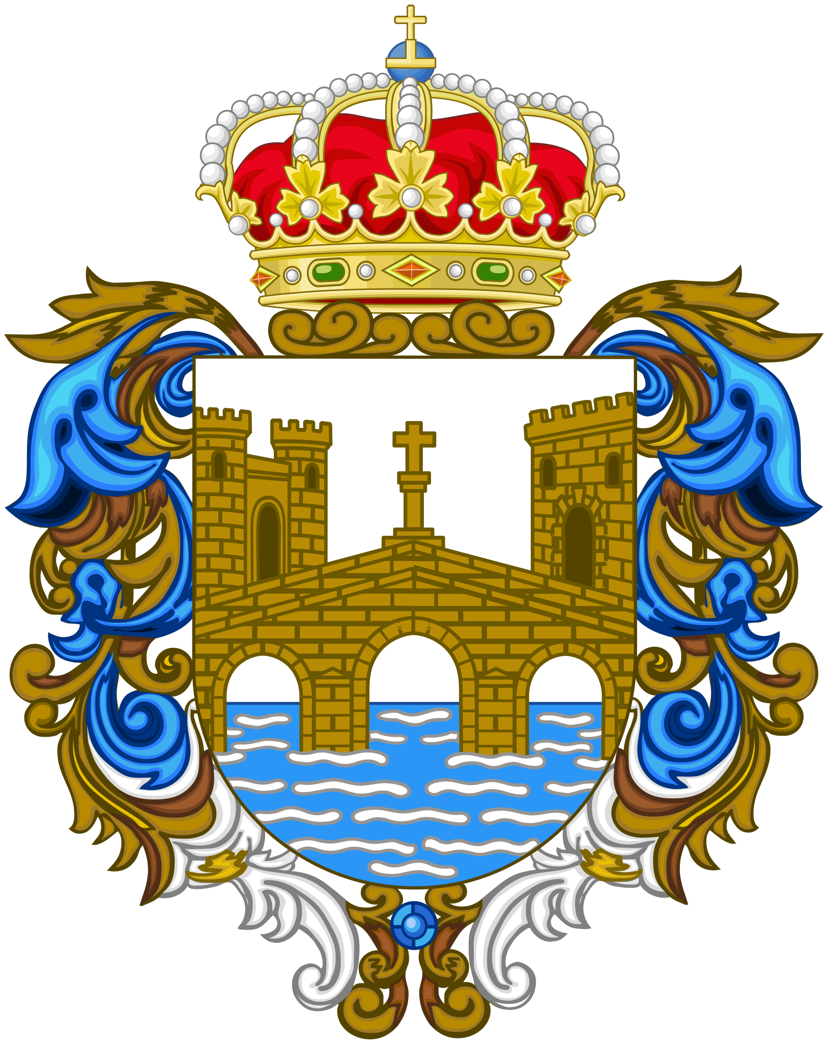 - Una torre o castillo sobre el puente: De color oro, con almenas, representa la defensa y fortaleza histórica de la ciudad.
