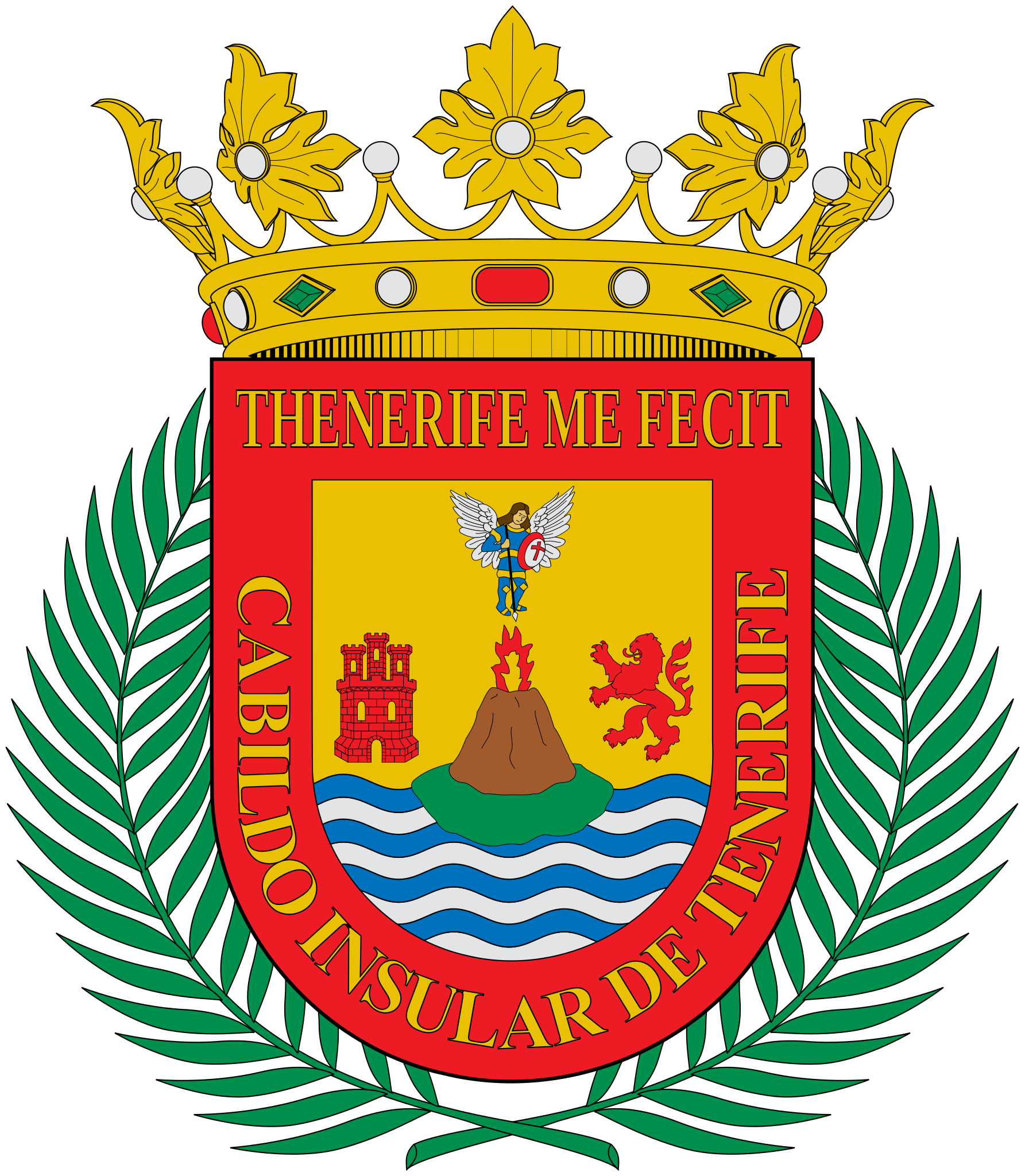 De oro, una isla de sinople sumada de un volcán (que representa al Teide) en su color escupiendo fuego, todo sobre ondas de azur y plata, adiestrado de un castillo de gules, siniestrado de un león de lo mismo y surmontado del Arcángel San Miguel (patrono de Tenerife) en su color, llevando una lanza en una mano y un escudo en la otra. Bordura de gules, con la leyenda Thenerife Me Fecit. Cabildo Insular de Tenerife en letras de oro. Al timbre, corona real abierta. Para diferenciar su escudo del de la ciudad de La Laguna, el Cabildo Insular añade dos ramas de palma bajo la punta.