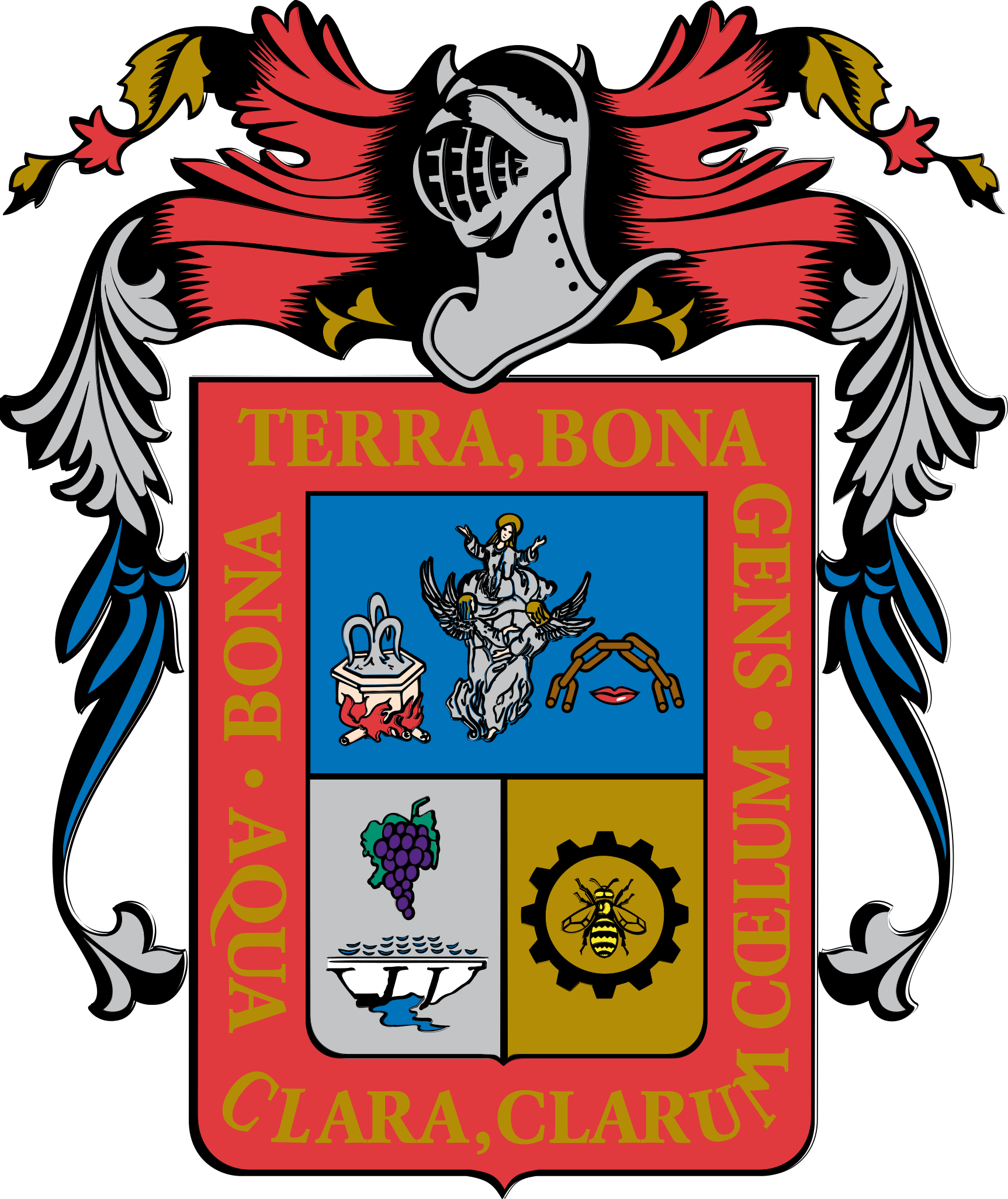 - Lema / bordura: rodeando el escudo está inscrita la frase en latín “Bona Terra, Bona Gens, Aqua Clara, Clarum Coelum” que significa: “Tierra buena, gente buena, agua clara, cielo claro”.