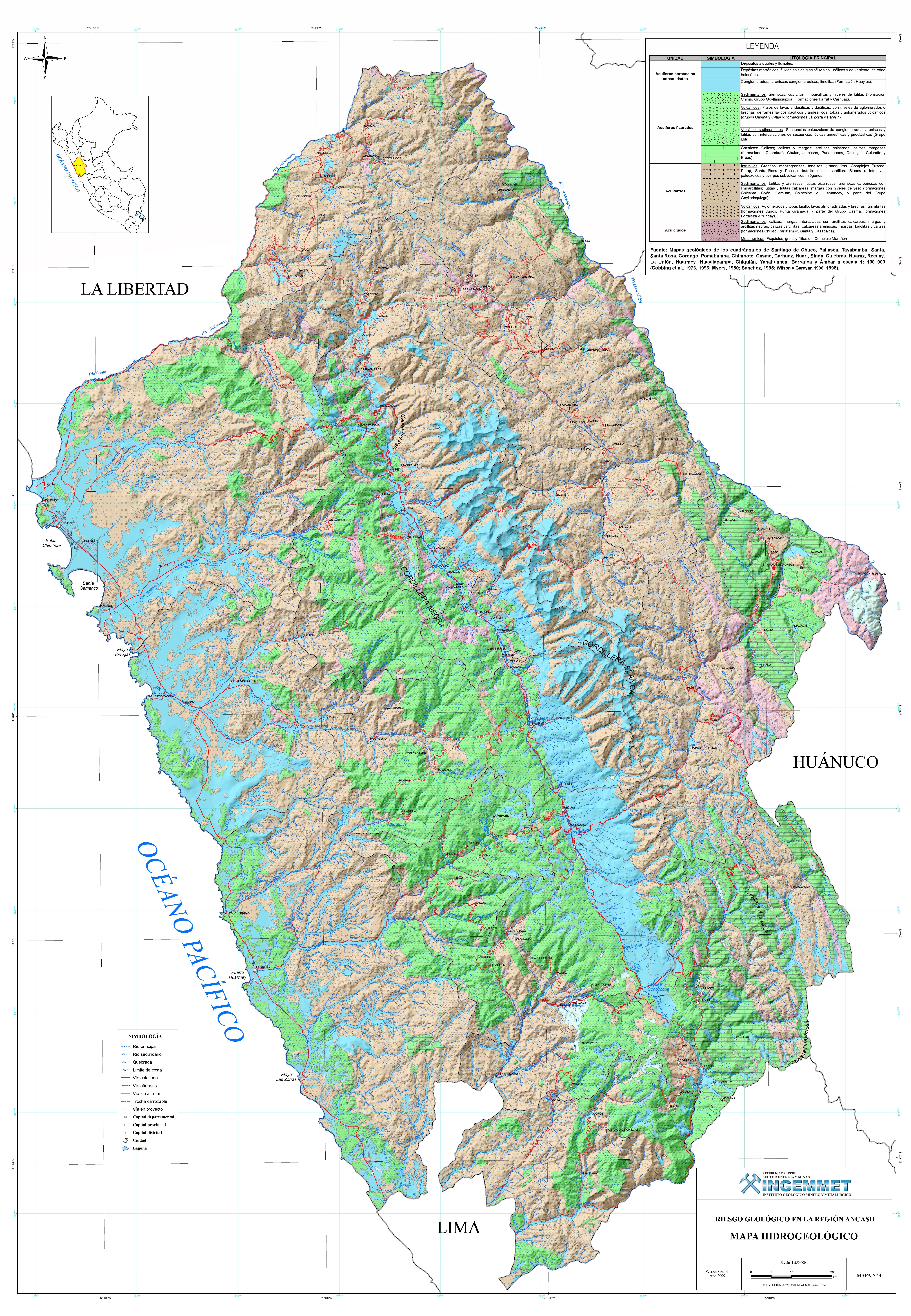 El accidentado territorio del departamento está atravesado por dos cadenas montañosas: al oeste, la Cordillera Negra, que tiene picos sin glaciares, y al este, la Cordillera Blanca, que tiene muchos picos cubiertos de nieve y hielo, como el Huascarán y el Alpamayo. Entre estas dos sierras, el río Santa corre por el llamado Callejón de Huaylas. Este valle se estrecha para formar el Cañón del Pato. También a lo largo de la vertiente del Pacífico, el río Santa ha formado un amplio valle en las punas que se estrecha en la Cordillera Negra, donde se formó el Cañón del Pato.