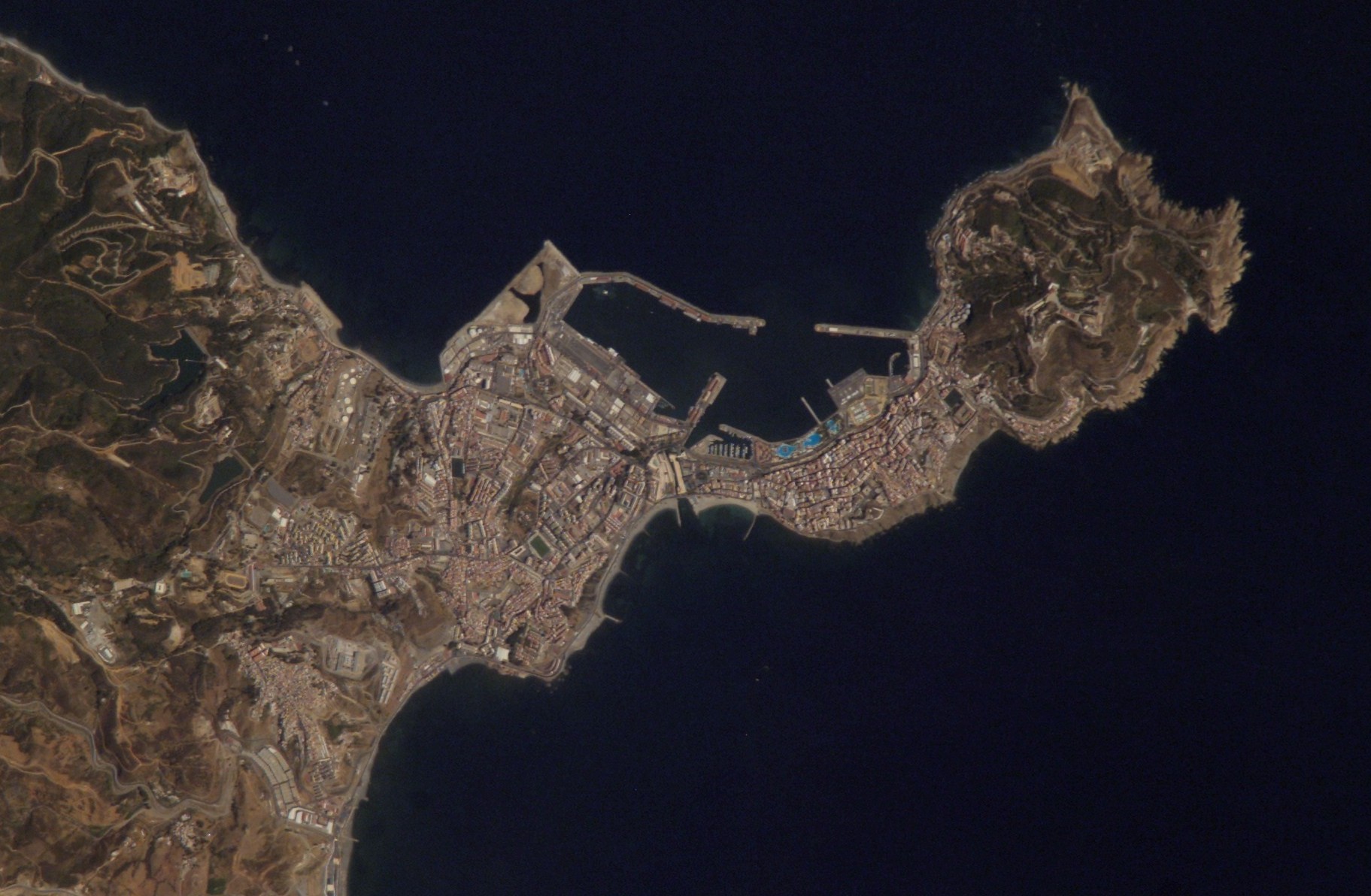 Imagen satélite del pequeño enclave español de Ceuta, que ocupa un estrecho istmo de tierra en el lado africano del Estrecho de Gibraltar; el resto del territorio circundante es Marruecos.