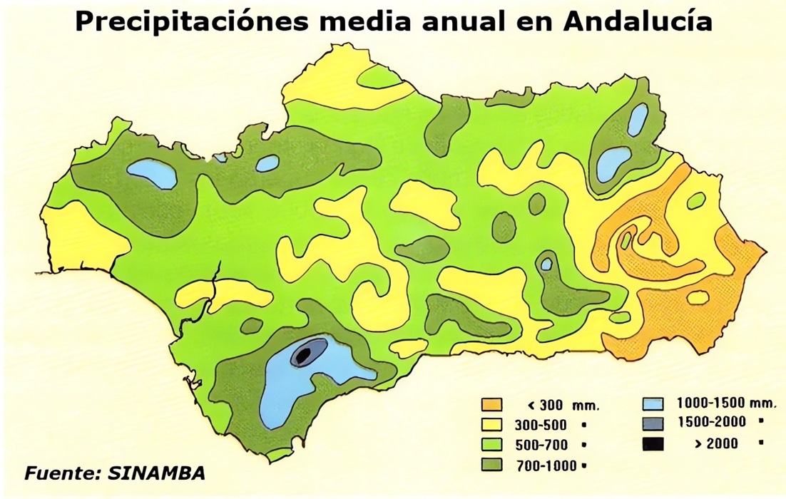 Andalucía es el lugar con el clima más cálido y seco de España, con una media anual de precipitaciones de alrededor de 150 milímetros en Cabo de Gata, así como uno de los más húmedos, con una media anual de precipitaciones de más de 2.000 milímetros en el interior de Cádiz. En el oeste, los sistemas meteorológicos que llegan desde el Atlántico garantizan que el invierno sea relativamente húmedo y lluvioso, con algunas zonas que reciben cantidades abundantes. Contrariamente a lo que mucha gente piensa, en general, la región disfruta de una pluviosidad anual superior a la media en el contexto de España.