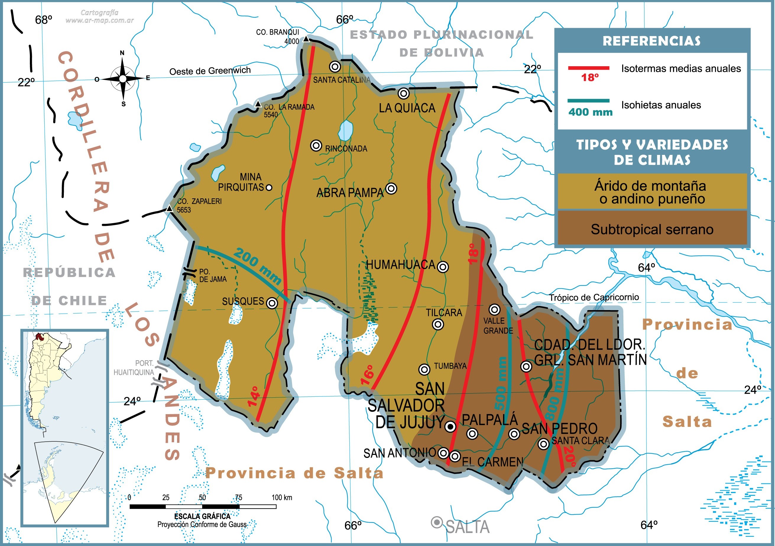 La provincia de Jujuy presenta una gran diversidad climática debido a sus fuertes contrastes de altitud y relieve. En pocos kilómetros se pasa de zonas cálidas y húmedas a regiones frías y áridas de alta montaña.