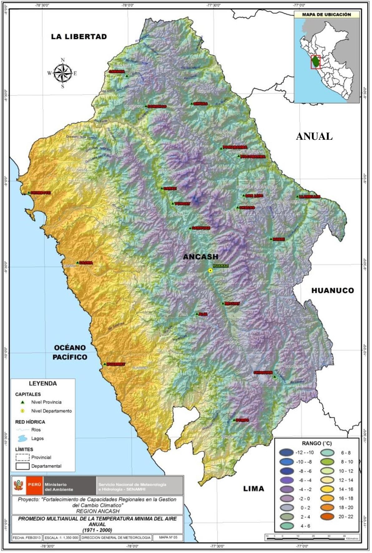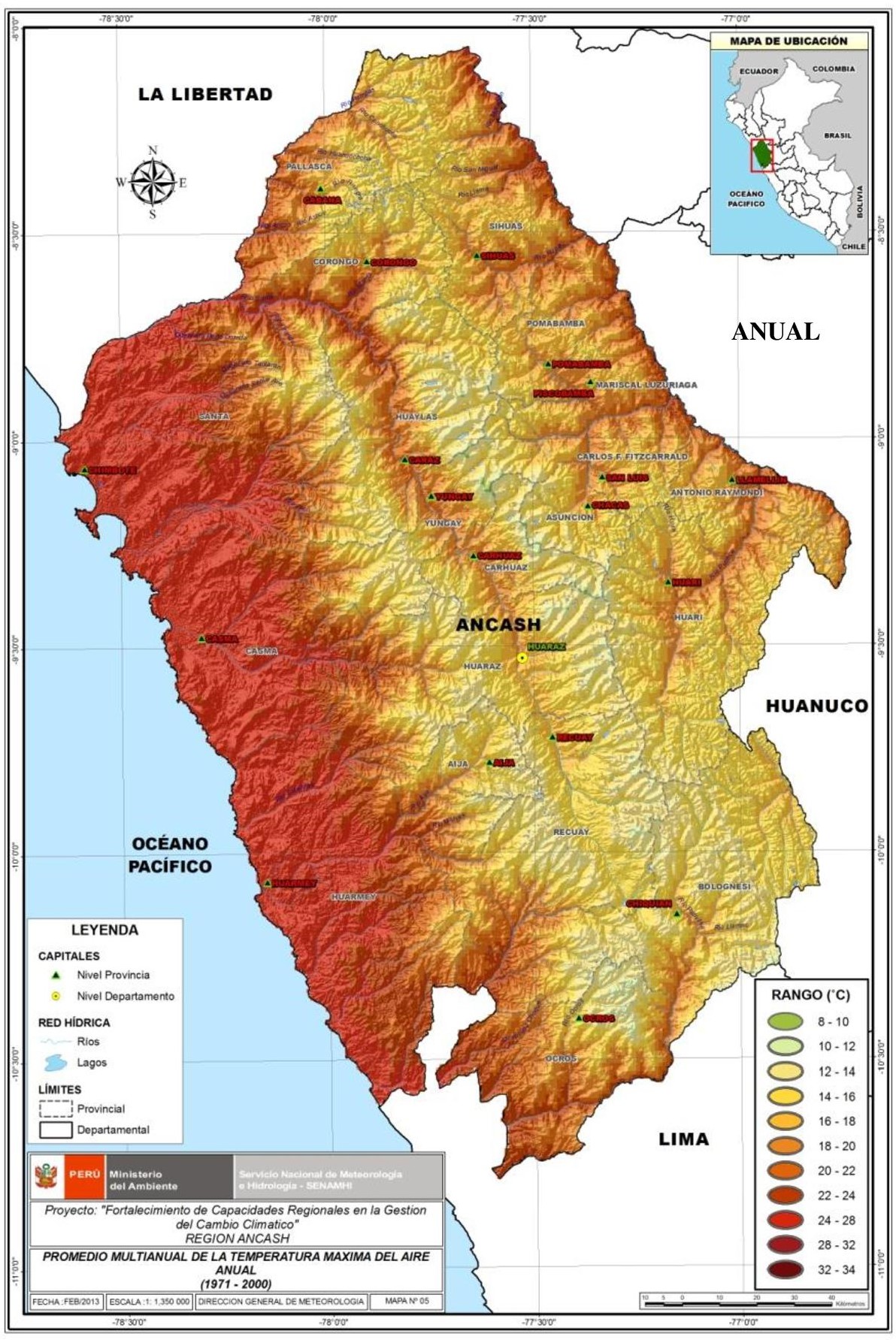 El clima del departamento de Áncash es variado. En la costa, el piso inferior de la vertiente occidental, el clima es desértico, con lluvias muy escasas y mal distribuidas que se incrementan a medida que se avanza en altitud; zonas con clima templado y seco se encuentran en los pisos medios de las vertientes andinas oriental y occidental, así como en el Callejón de Huaylas; frío y seco en las punas y altas mesetas; muy frío en las cumbres nevadas. Al este de la Cordillera Blanca y en el fondo del valle formado por el río Marañón el clima es cálido-húmedo, con temperaturas altas durante el día y la noche.