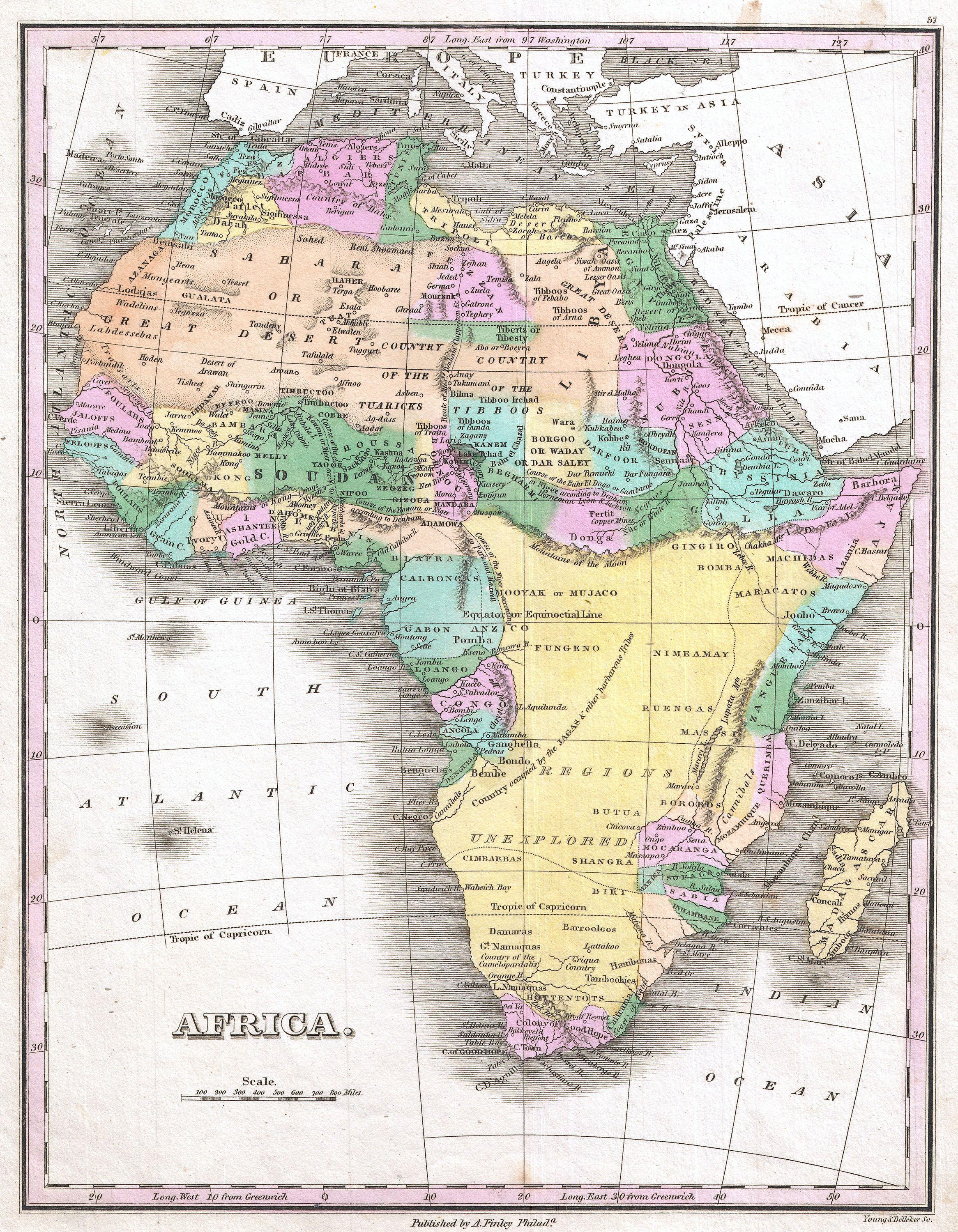 Mapa de África de Finley de 1827 (formato PDF). Este mapa poco común data de antes del auge de la exploración africana a mediados del siglo XIX. Gran parte del interior permanece desconocida. Los Montes Ptolemaicos de la Luna se extienden por la parte central del continente, sugiriendo que son el nacimiento de varios brazos del Nilo. Se trazan varios cursos especulativos para el río Níger: uno de los cuales se une al Nilo, otro fluye al sur de los Montes de la Luna hacia el Congo, y otro, correctamente, se desvía hacia el sur para desembocar en la bahía de Biafra. Identifica numerosas tribus africanas, como los pomba, jaga, tombuctú, tuareg, tibboos, bambara y otros. También identifica una tierra de caníbales en Mozambique. Título y escala en el cuadrante inferior izquierdo. Grabado por Young y Delleker para la edición de 1827 del Atlas General de Anthony Finley.