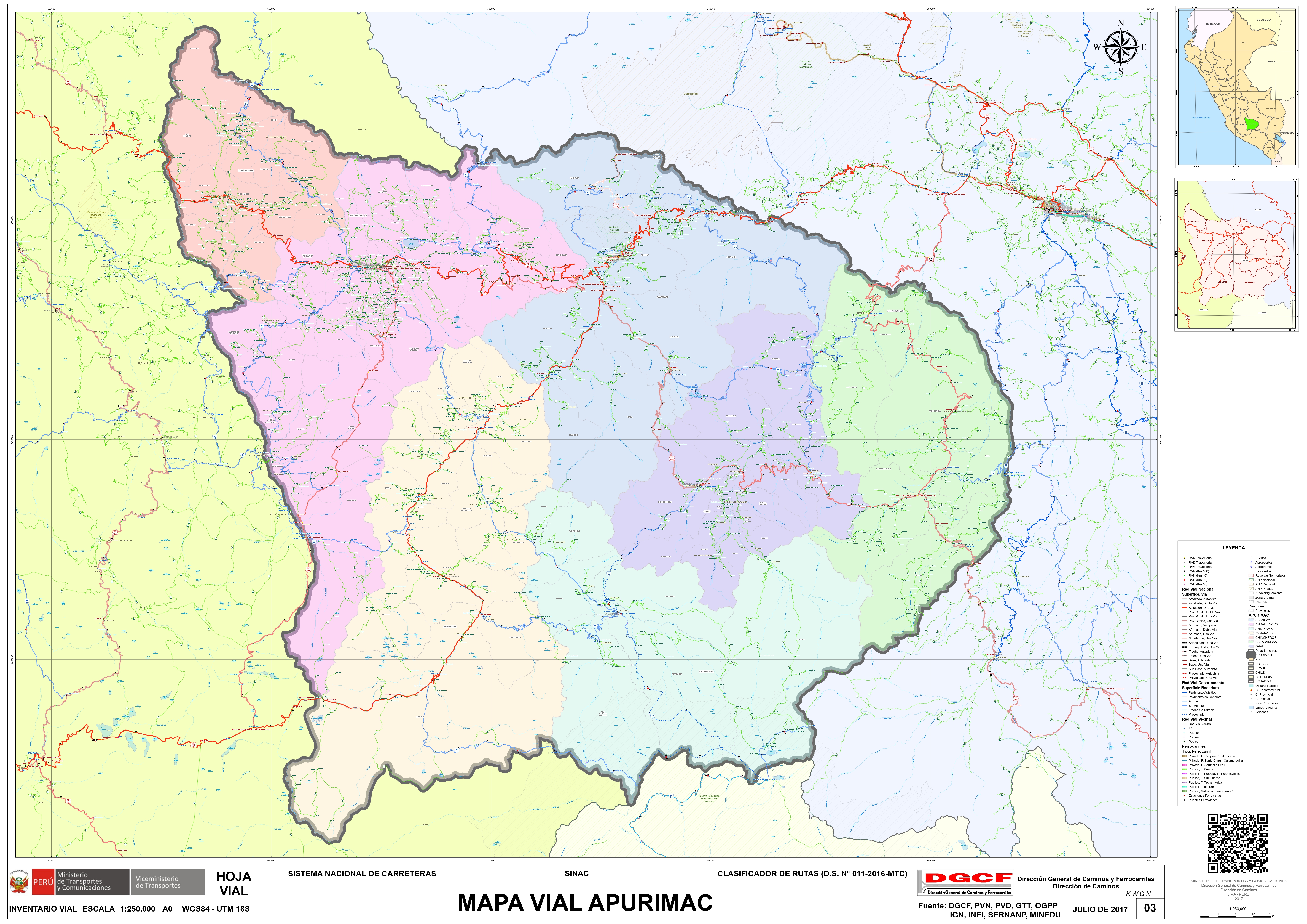 Apurímac cuenta con una red vial de 1 157,1 kilómetros de vías nacional, 1 339,0 kilómetros vías departamental y 4 984,2 kilómetros de vías terrestre por la red vial nacional por Longitudinal de la Sierra Sur, Ruta nacional PE-30, Ruta nacional PE-3SF.