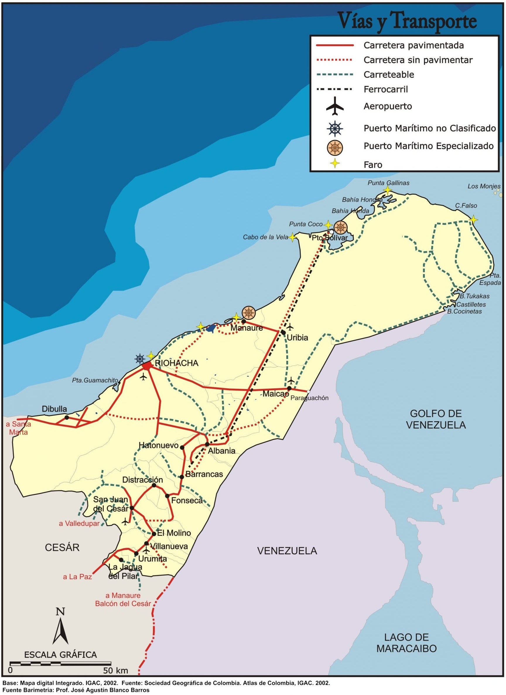 En resumen, la red de carreteras de La Guajira se organiza alrededor de la Troncal del Caribe, pero se vuelve más precaria hacia el norte, donde predominan caminos informales adaptados al desierto.