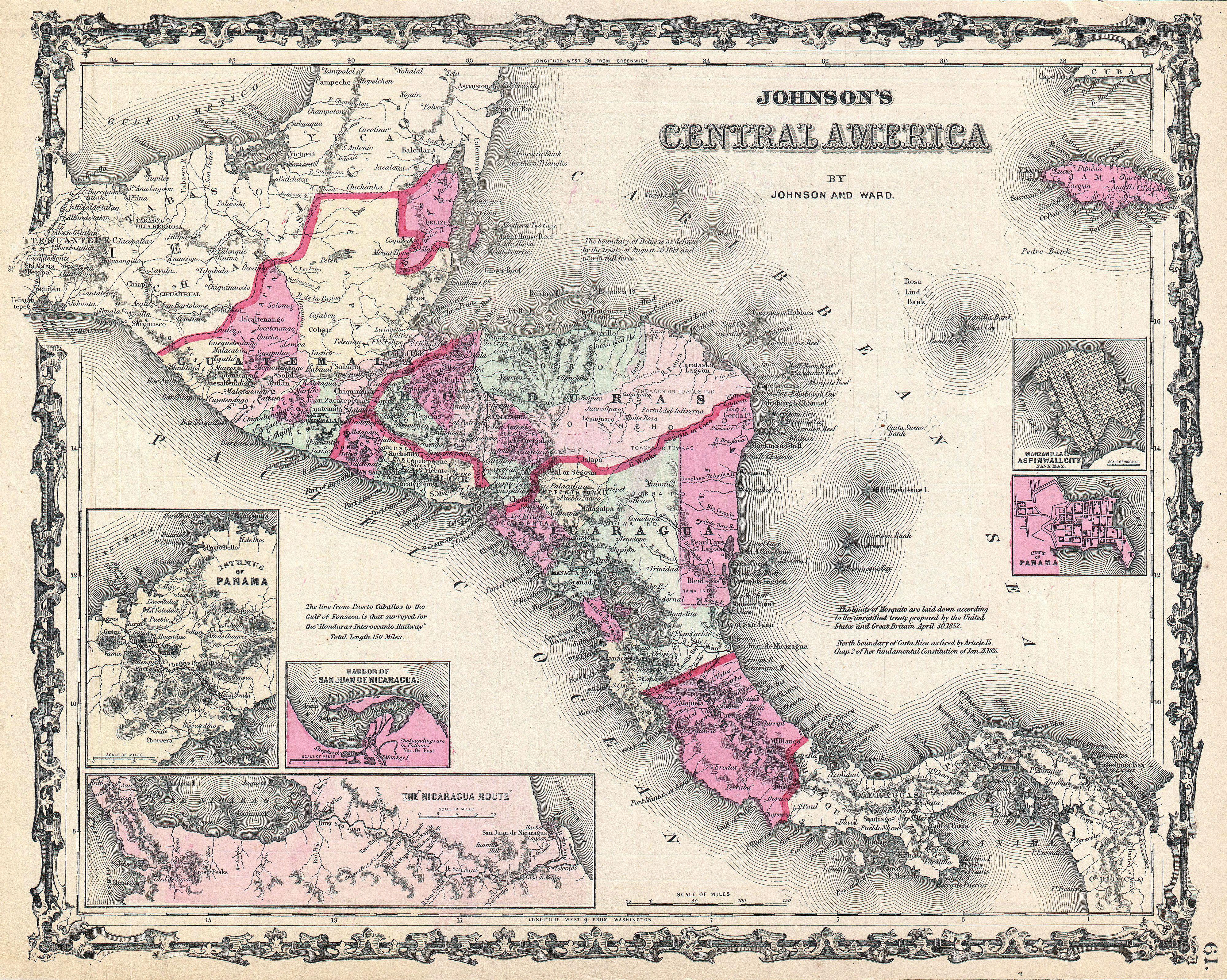 Este es el mapa de Centroamérica de A. J. Johnson y Ward de 1862. Abarca Centroamérica desde el Istmo de Tehuantepec, México, hasta la Bahía de Panamá. Muestra los países de Guatemala, Honduras, El Salvador, Nicaragua y Costa Rica. Jamaica aparece en la esquina superior derecha. Muestra las carreteras, ciudades, ríos y cruces de ferry propuestos.