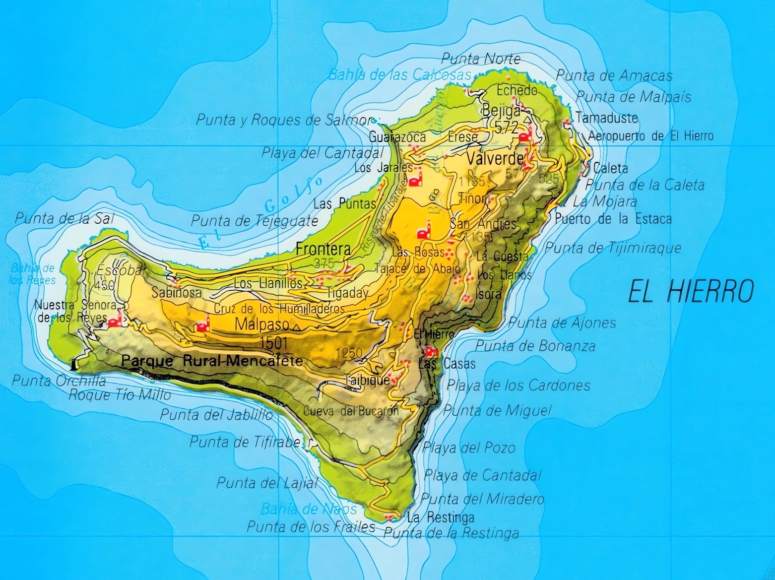 Mapa de El Hierro (formato PDF), la más occidental y meridional de las Islas Canarias (España), situada en el océano Atlántico. Pertenece a la provincia de Santa Cruz de Tenerife. Su capital es Valverde, donde, aparte de La Villa (casco urbano), también se encuentran el puerto de La Estaca y el aeropuerto insular.