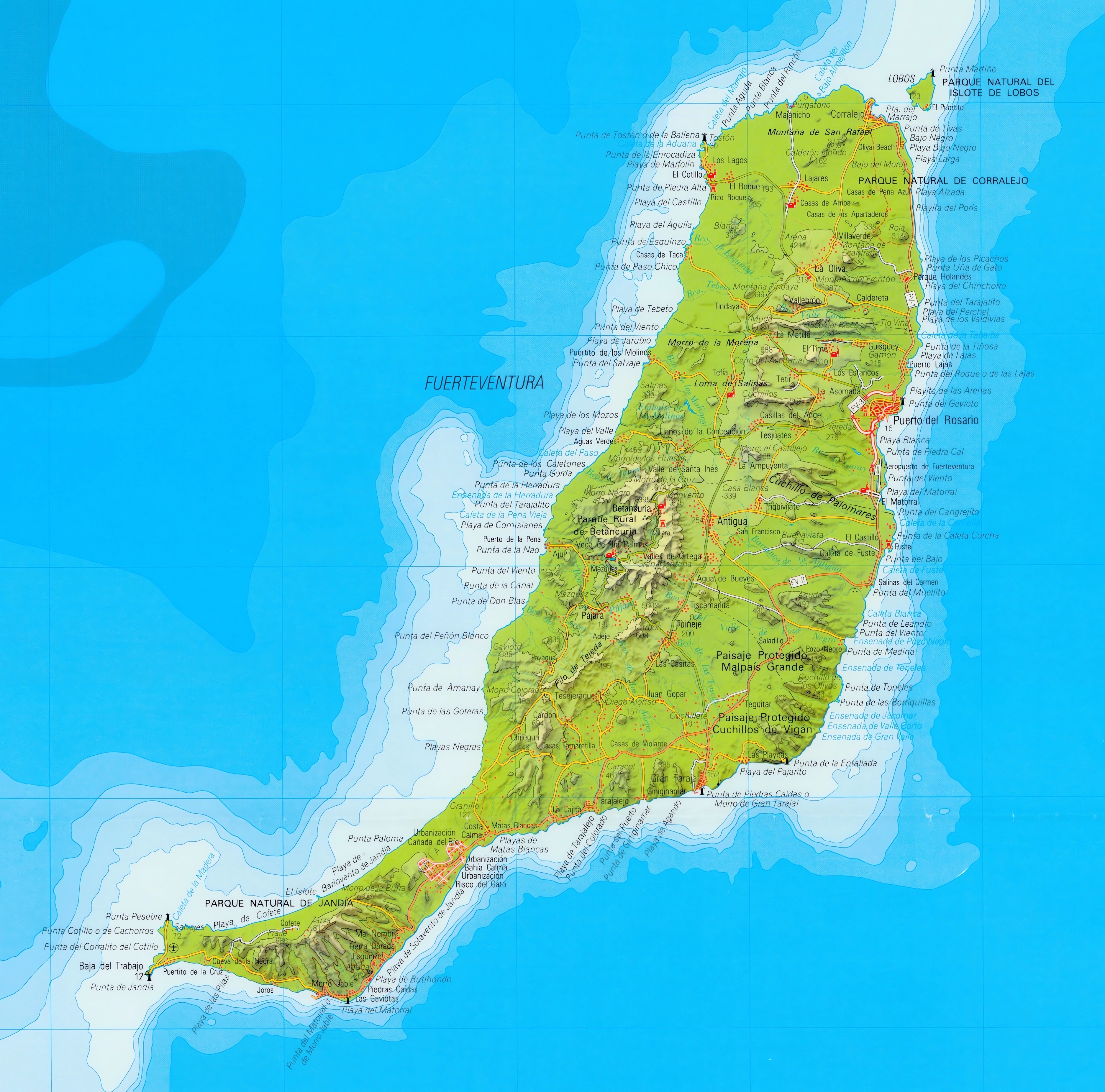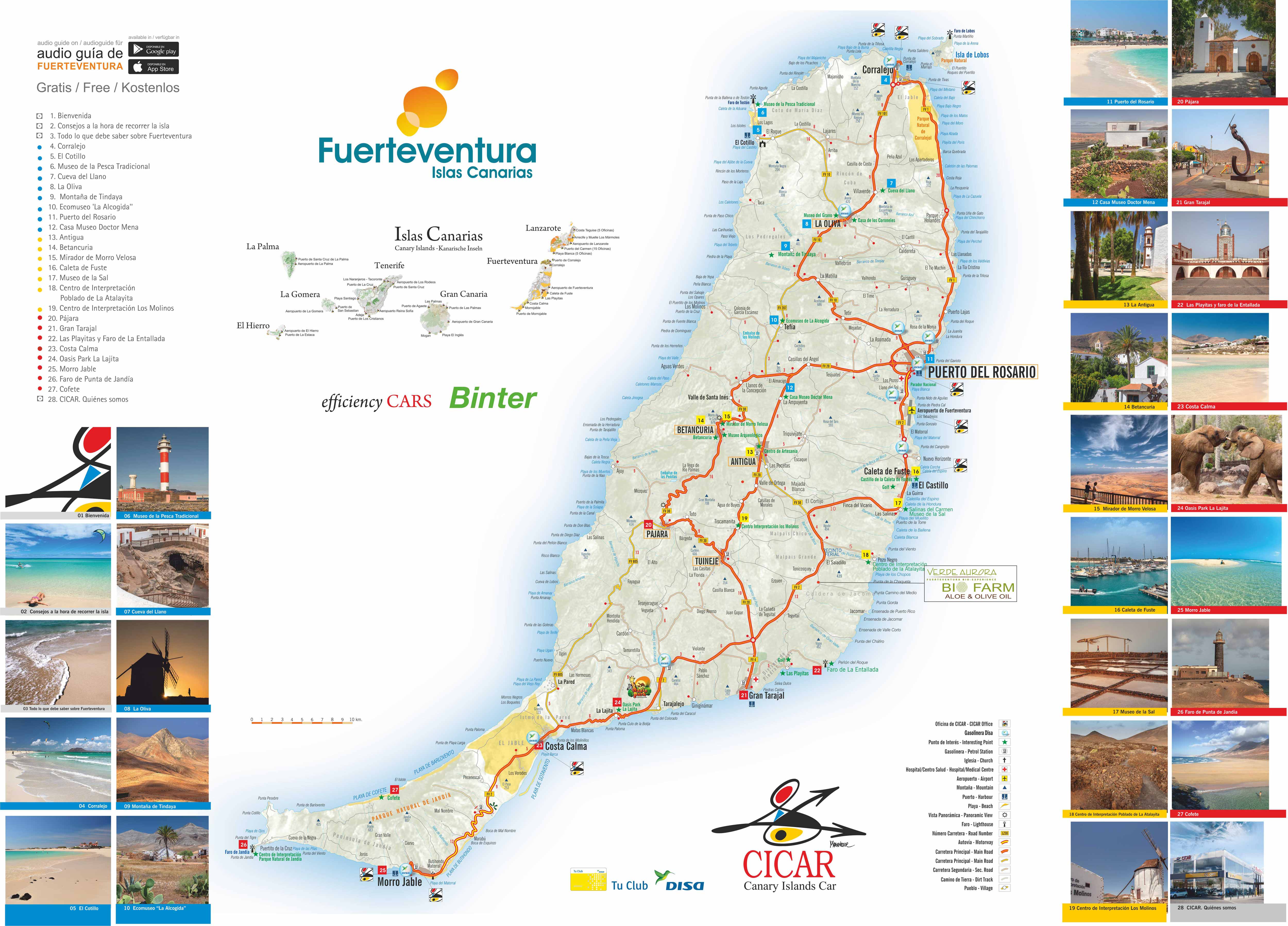 Mapa de Fuerteventura (formato PDF), una isla española del archipiélago de Canarias, perteneciente a la región de la Macaronesia, situada en el océano Atlántico, a 97 km de la costa noroeste del continente africano. El 26 de mayo de 2009 fue declarada en su totalidad una reserva de la biosfera por la Unesco.