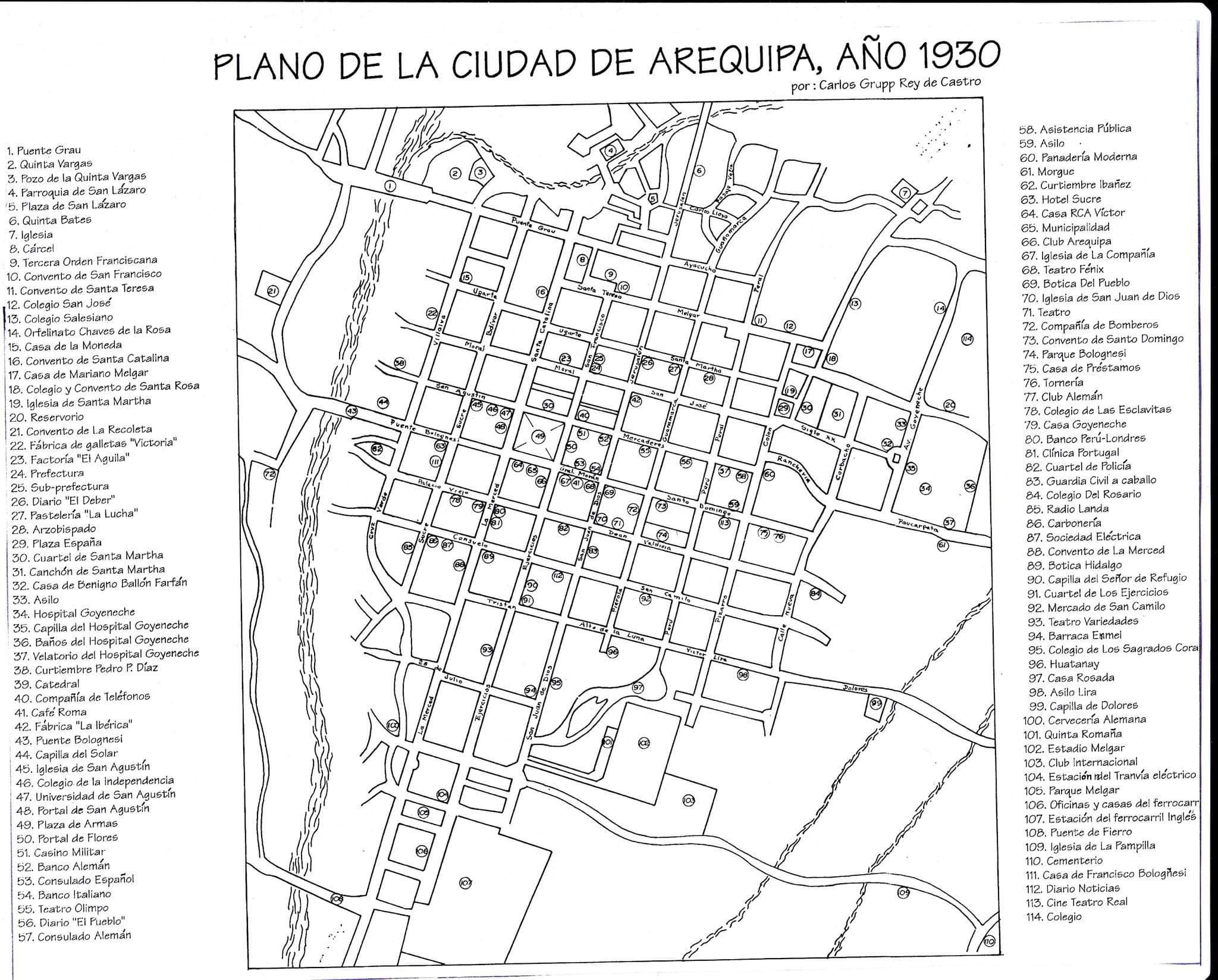 Mapa de la ciudad de Arequipa, capital de la provincia y departamento homónimos, así como la segunda ciudad más poblada de la República del Perú. Desde el punto de vista político cumple el rol de sede oficial del Tribunal Constitucional y es considerada como la «Capital Jurídica del Perú». Arequipa es referida también como La ciudad blanca o León del sur.