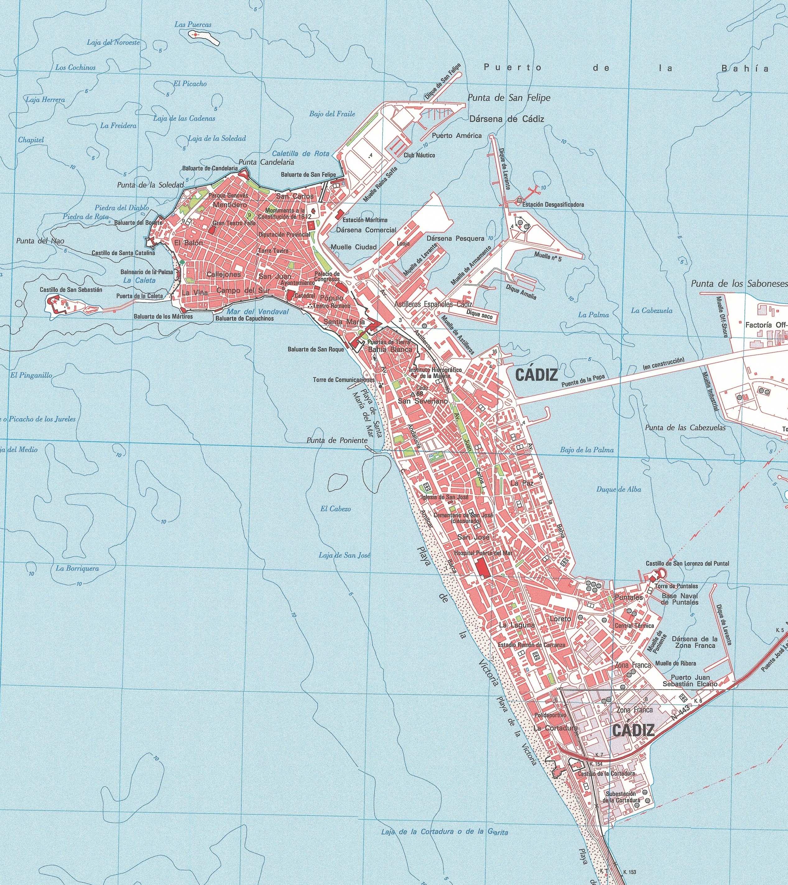 Cádiz es una península, unida por un tómbolo a la isla de León, que a su vez está separada del continente por un estrecho canal llamado Caño de Sancti Petri que atraviesa las marismas. La ciudad se sitúa frente al estuario del río Guadalete, e inmersa en el parque natural de la Bahía de Cádiz, a 122 km de la capital autonómica, Sevilla. El conjunto formado por Cádiz y San Fernando está separado de la península ibérica por el mencionado Caño de Sancti Petri. Históricamente, el territorio de Cádiz se constituyó, en un principio, como un pequeño archipiélago (llamado Gadeiras), como una sola isla, situación en la que se debate si se encuentra en la actualidad. Esta particularidad hace que sea difícil definir su condición geográfica, aunque hoy día recibe un plan de tratamiento insular. Fue bautizada por Lord Byron como «Sirena del Océano» y se le conoce popularmente como la «Tacita de Plata».