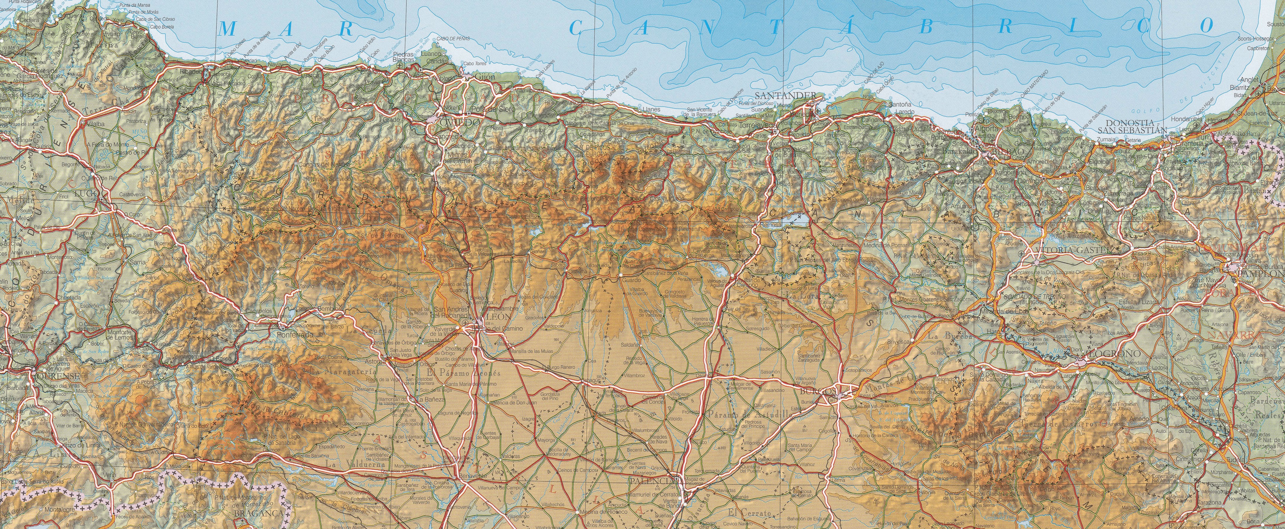El descenso desde la cordillera meridional hasta las altas mesetas de Castilla es más gradual, y varios grandes ríos, en particular el Ebro, nacen aquí y fluyen hacia el sur o el oeste. La anchura de la cadena cantábrica, con todas sus ramificaciones, aumenta desde unos 97 km en el este hasta unos 185 km en el oeste. Muchos picos superan los 1.800 m de altura, pero las mayores altitudes se alcanzan en las cordilleras centrales, en los límites de León, Asturias, Palencia y Cantabria. En ella se encuentran las cumbres más altas, la Torre de Cerredo (2.648 m), la Peña Vieja (2.615 m), la Peña Prieta (2.531 m) y el Espigüete (2.407 m); en la margen derecha del Sella se alza una cumbre sin nombre de los Picos de Europa, a cuya cordillera pertenece también la Peña Vieja, que alcanza los 2.452 m; más al oeste, los picos de Manpodres, Peña Ubiña, Peña Rubia y Cuiña superan los 2.100 m. Una característica llamativa de la cadena, como de la meseta adyacente, es el número de sus parameras, mesetas aisladas encerradas por altas montañas o incluso por escarpadas paredes de roca.