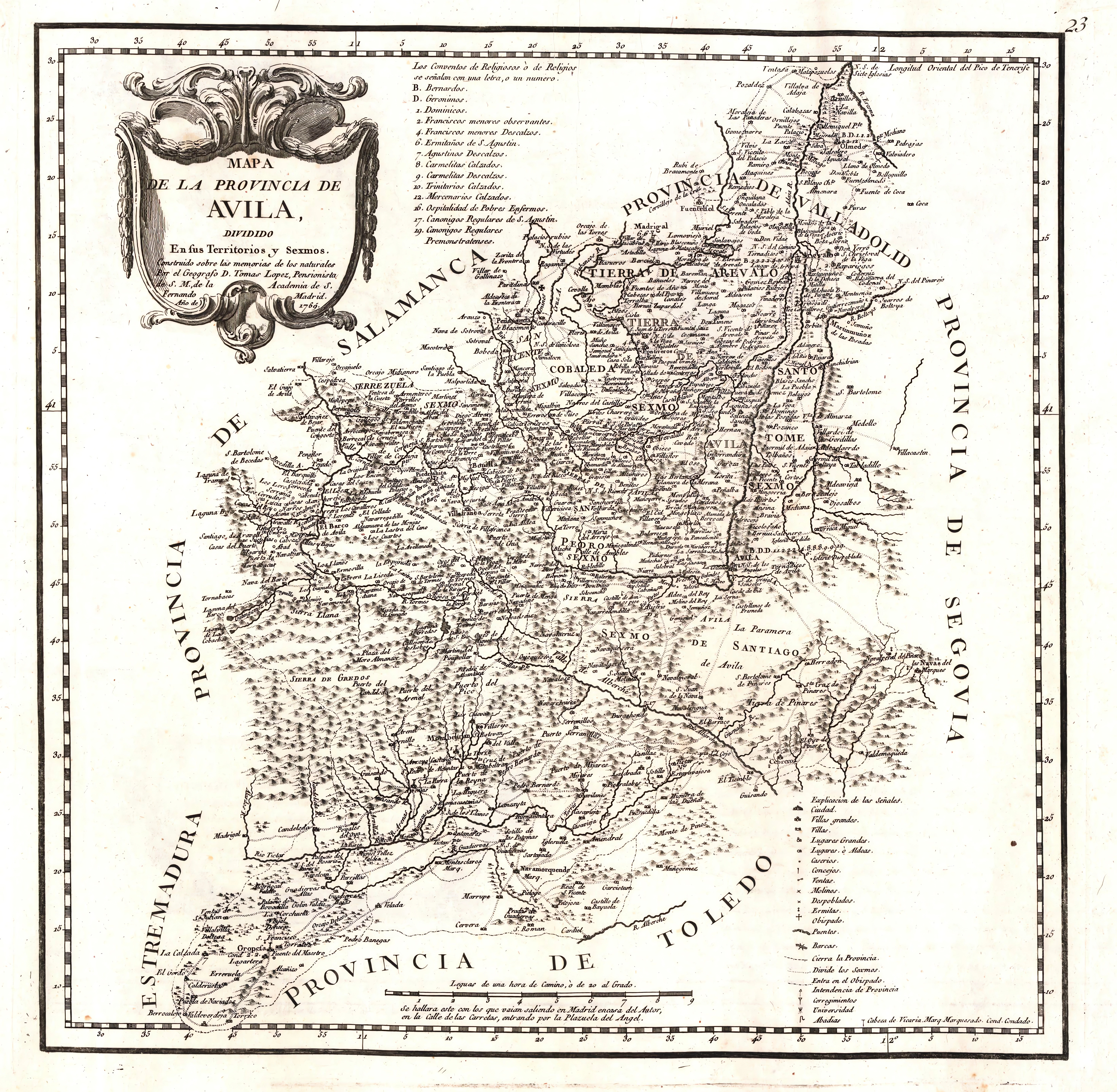 Comprende la provincia de Ávila. Pertenece al » Atlas Geográfico de España», recopilación de 102 mapas que realizó Tomás López y que se publicó en 1804, 1810, 1830 y 1844 ya por los hijos del autor muerto en 1802. En la esquina superior derecha, fuera del marco, figura el nº 23 correspondiente a la página del citado atlas. Marco con rotulación de grados y cada 5´con subdivisiones de 1´. Meridiano origen del pico del Teide, isla de Tenerife (Islas Canarias). En el ángulo superior izquierdo, cartela en forma de escudo, conteniendo el título, autor, ciudad y fecha de edición; a su derecha lista de conventos. En el margen inferior, signos convencionales, escala gráfica y el lugar donde podían ser adquiridas sus obras en Madrid. Relieve representado por perfiles de montañas abatidos con sombreado. Planimetría con ciudades representadas por agrupación de edificios, edificios aislados, red de comunicaciones, masas de arbolado y división político-administrativa y eclesiástica. La hidrografía representa la red principal, con denominación de los ríos más importantes. Abundante toponimia. Rotulación con letra romanilla e itálica. Datado durante el reinado de Carlos III (1759-1788).