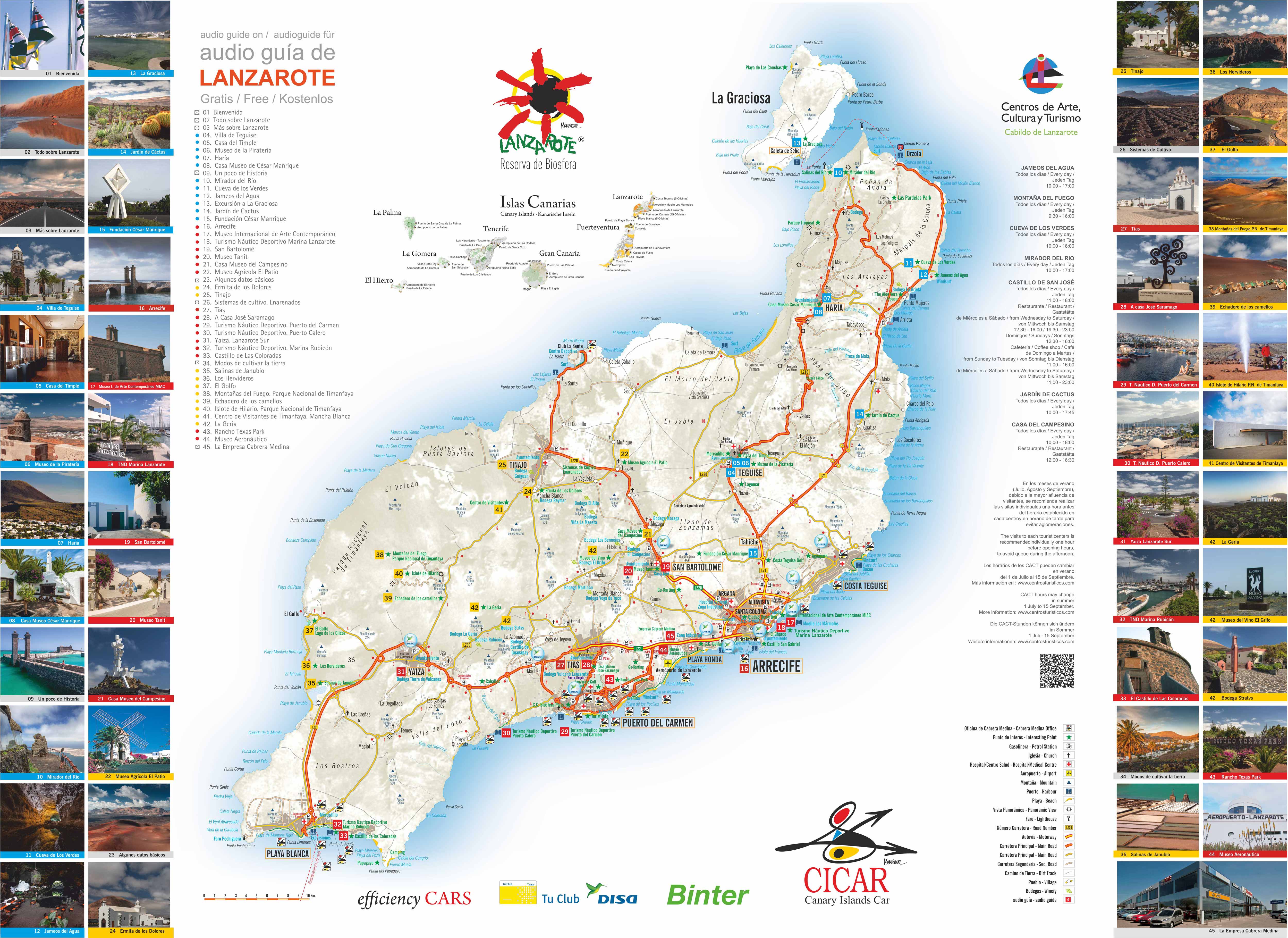 Mapa de Lanzarote (formato PDF), una isla española, la más oriental de las Islas Canarias, a 125 kilómetros de la costa norte de África y a 1.000 kilómetros de la Península Ibérica.