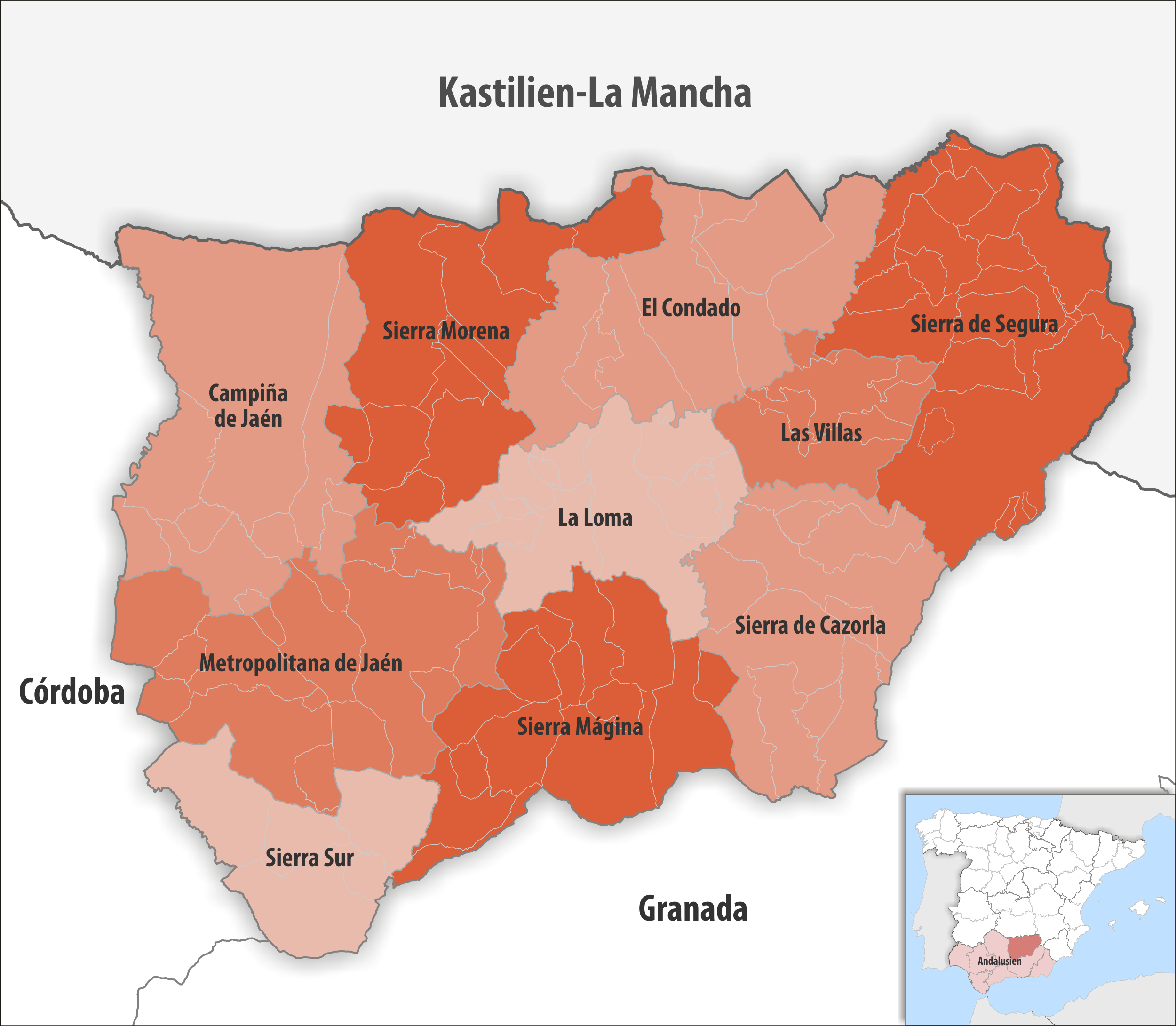 De acuerdo con el catálogo elaborado por la Consejería de Turismo y Deporte de la Junta de Andalucía (27 de marzo de 2003), la provincia de Jaén se encuentra dividida en 10 comarcas de carácter geográfico, que se enumeran a continuación por orden alfabético: