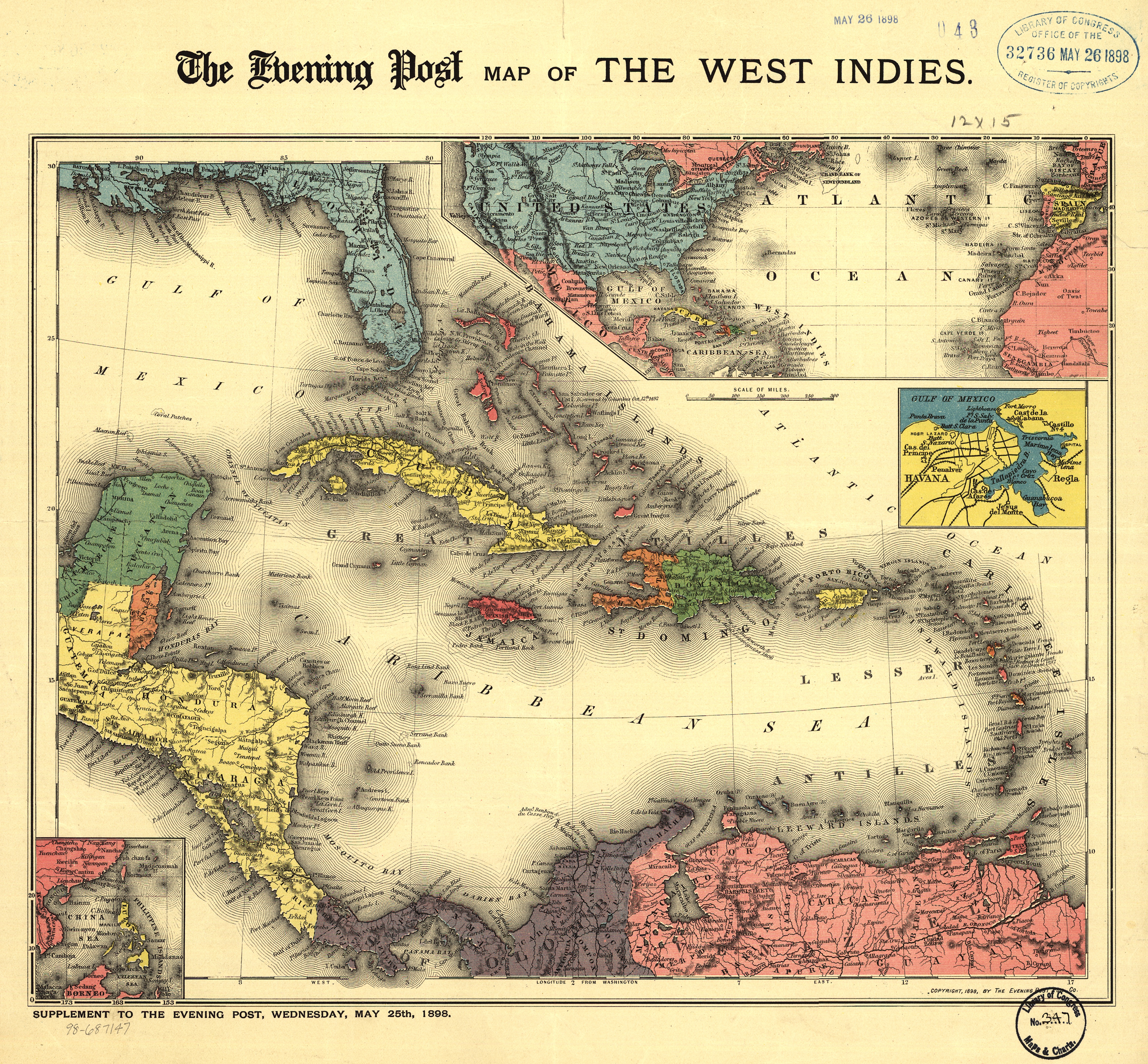 Mapa (título original: The Evening Post Map of the West Indies) elaborado durante la Guerra Hispano-Estadounidense (Spanish-American War, 1898). Su finalidad era informar al público estadounidense sobre la geografía de los teatros de conflicto o interés colonial: Cuba, Filipinas, etc. Fechado en 1898, publicado como suplemento al Evening Post, el 25 de mayo.
