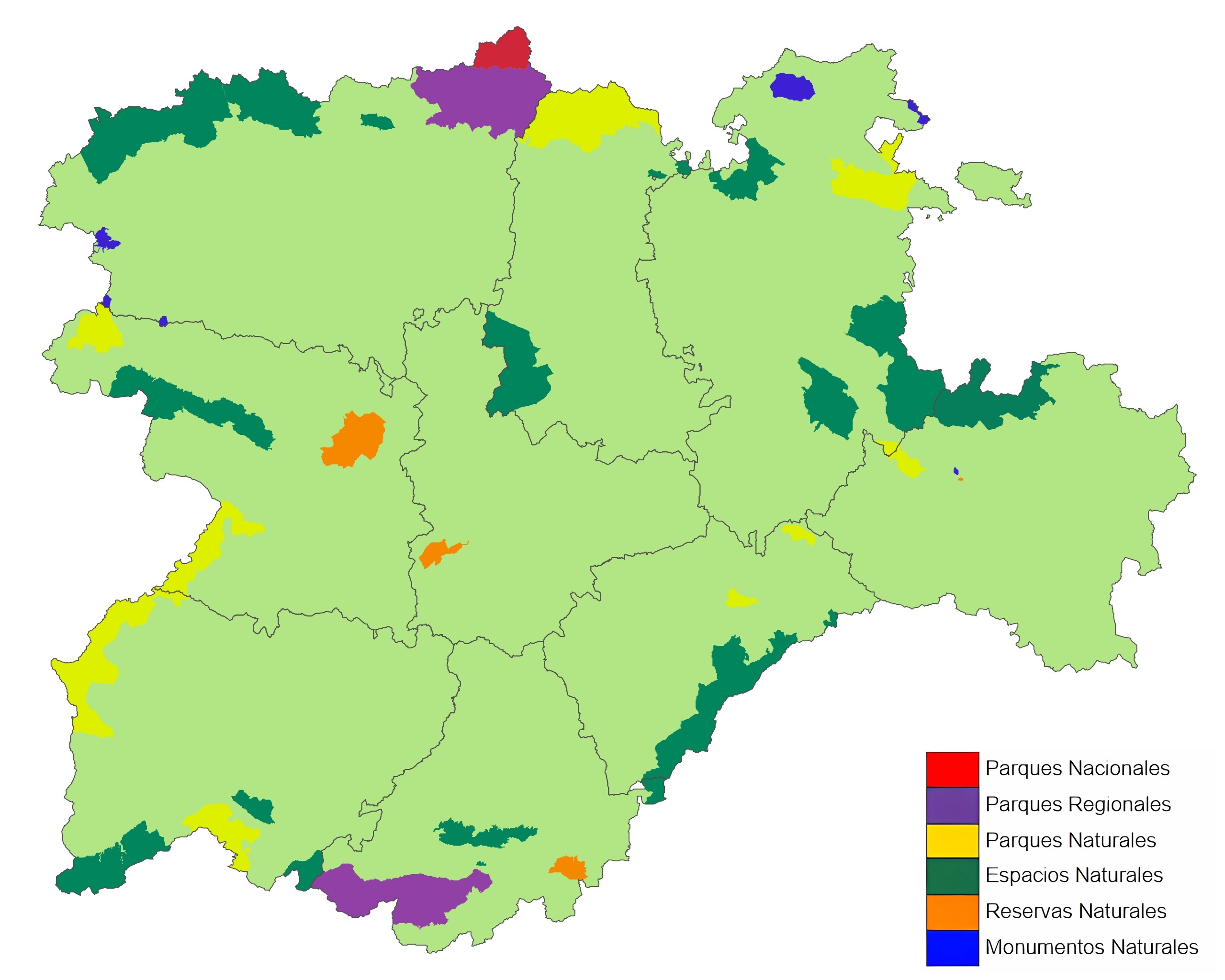 Por tanto, son cuarenta todos los espacios naturales protegidos de la comunidad autónoma de Castilla y León. Estos parajes se han ido declarando como parques regionales, parques naturales, reservas naturales o monumentos naturales excepto 13 de ellos que permanecen protegidos a la espera de una de estas declaraciones. Excepcionalmente, el Puerto de Orduña, la Sierra de la Demanda y el Valle de San Emiliano, han sido declarados cambiando su nombre. De esta manera, ahora se conocen como el Monumento natural del Monte Santiago, el Parque natural de las Lagunas Glaciares de Neila y el Parque natural de Babia y Luna respectivamente. La Sierra de Urbión, además haber cambiado su nombre, ha dado lugar a dos espacios distintos, declarados como Parque natural de la Laguna Negra y los Circos Glaciares de Urbión y Reserva Natural del Acebal de Garagüeta.