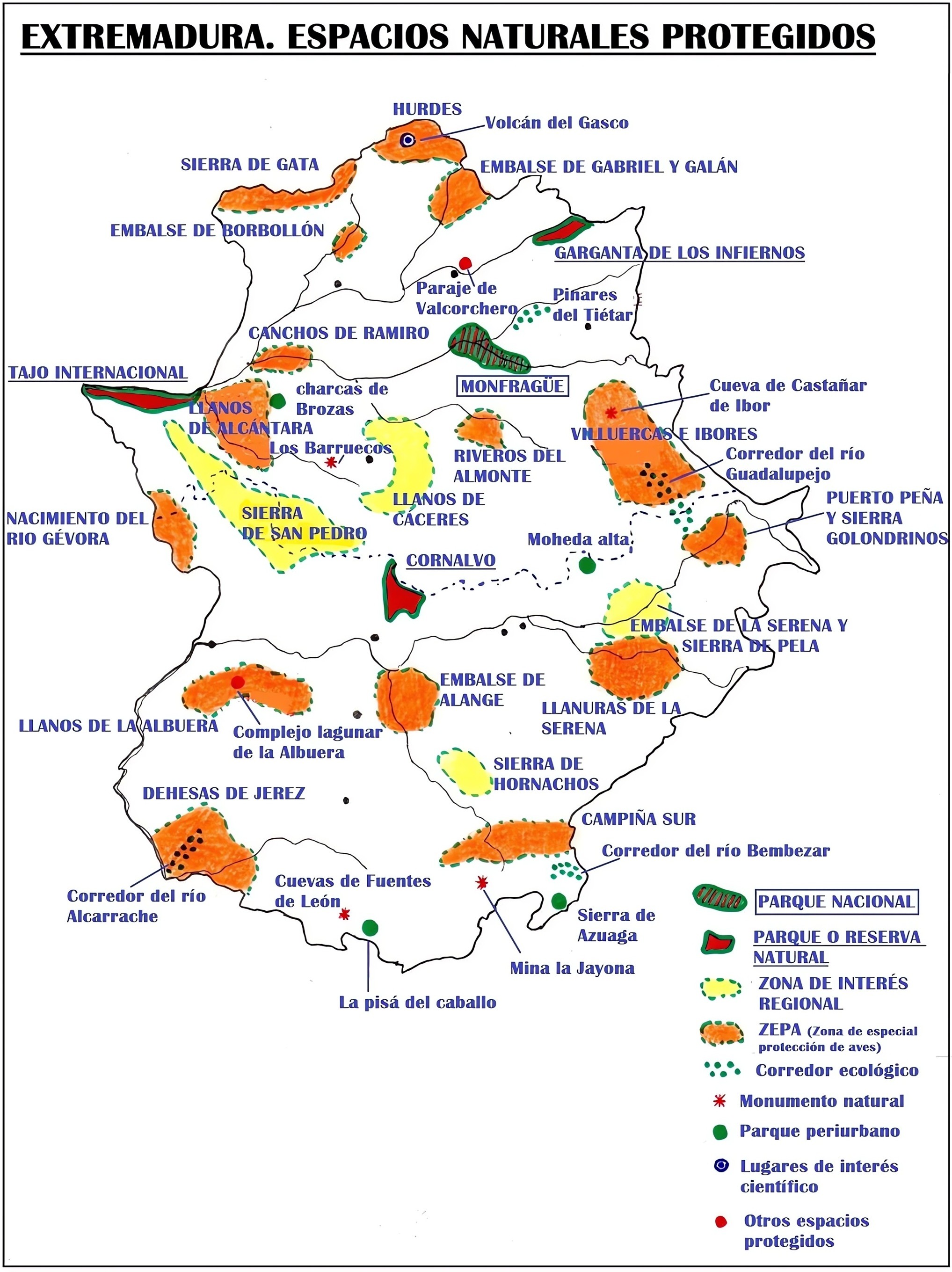 Extremadura es una de las regiones europeas que cuenta con el sistema natural menos degradado del continente, pese a ello el número y nivel de protección de estos espacios es claramente insuficiente. No obstante, Extremadura posee un parque nacional, dos parques naturales, una reserva natural, un paisaje protegido, un geoparque, cuatro monumentos naturales y numerosas ZEPAs, o zonas especiales de protección de las aves.