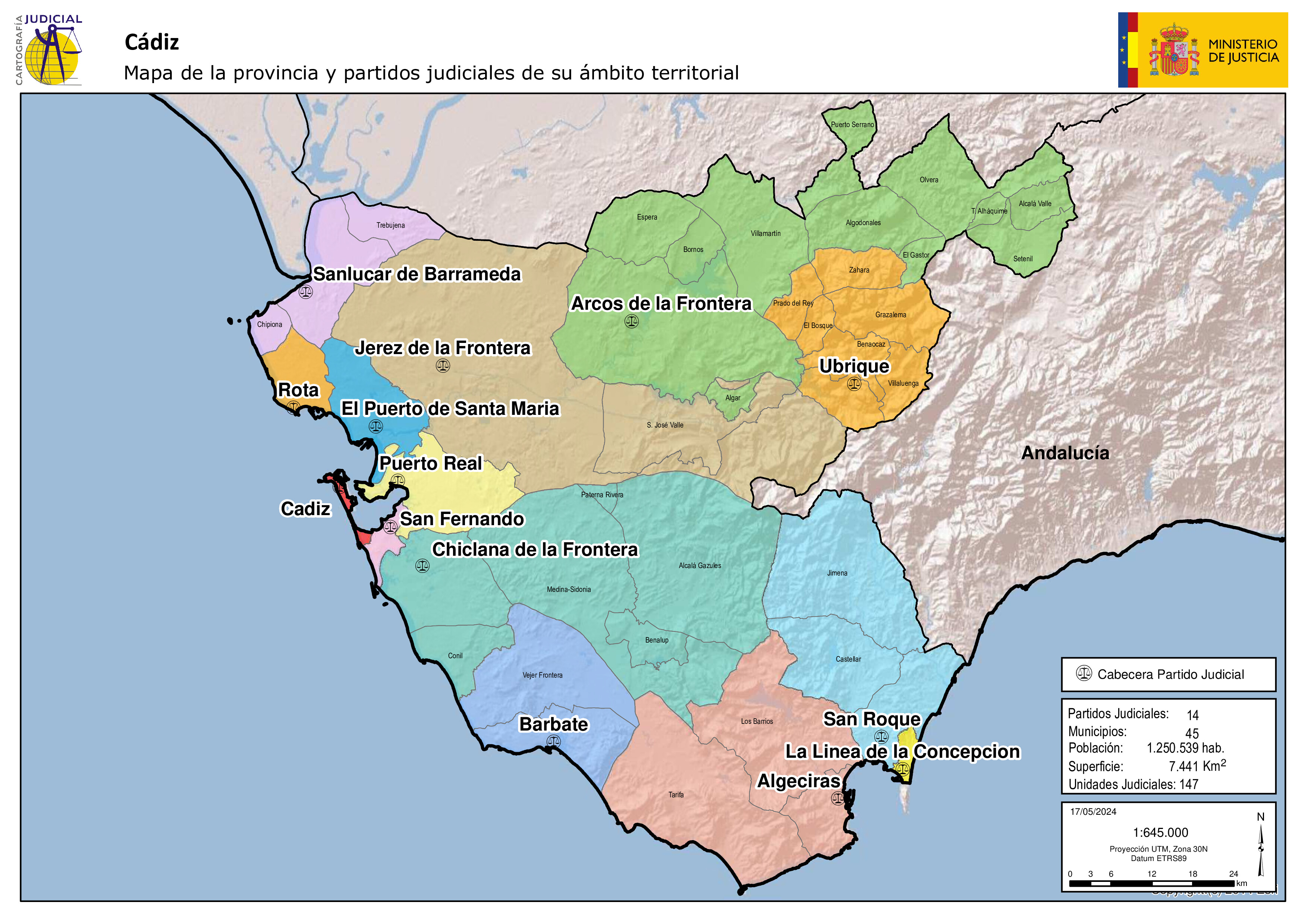 En virtud de dicha ley, los municipios de la provincia de Cádiz se distribuyen en los partidos judiciales que se indican en el siguiente listado: