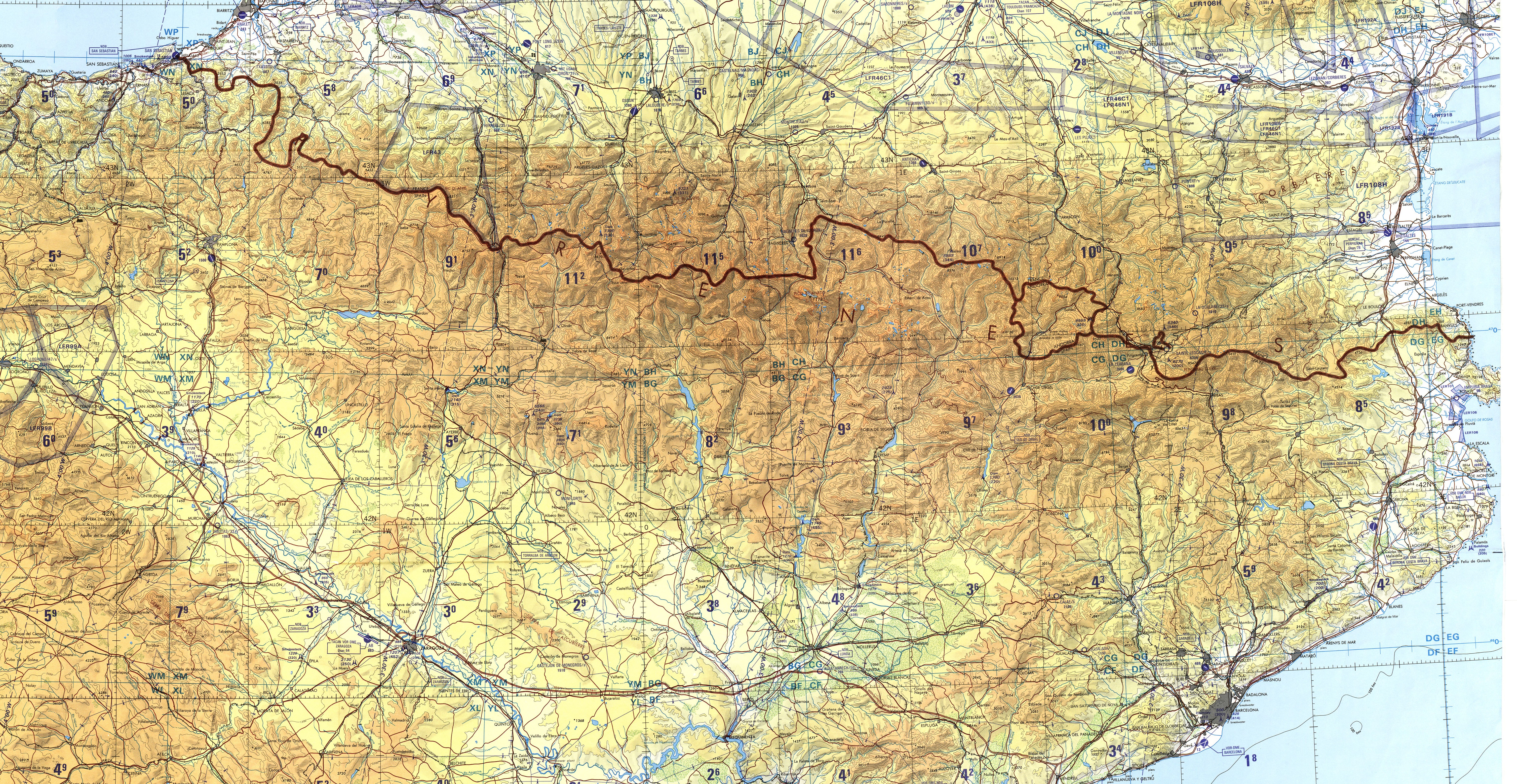 Mapa de los Pirineos (formato PDF), una cadena montañosa del suroeste de Europa. Se extienden en longitud en dirección este-oeste a lo largo de una distancia aproximada de 430 kilómetros desde el mar Mediterráneo (cabo de Creus) hasta el golfo de Vizcaya (cabo de Higuer) y culminan a 3.404 metros sobre el nivel del mar en el pico Aneto. Barrera geográfica fruto de la colisión de las placas ibérica y euroasiática, los Pirineos separan la península Ibérica, al sur, del resto de la Europa continental, al norte. Se extienden por tres estados, Andorra, España y Francia, y durante siglos han formado una frontera natural entre estos dos últimos.