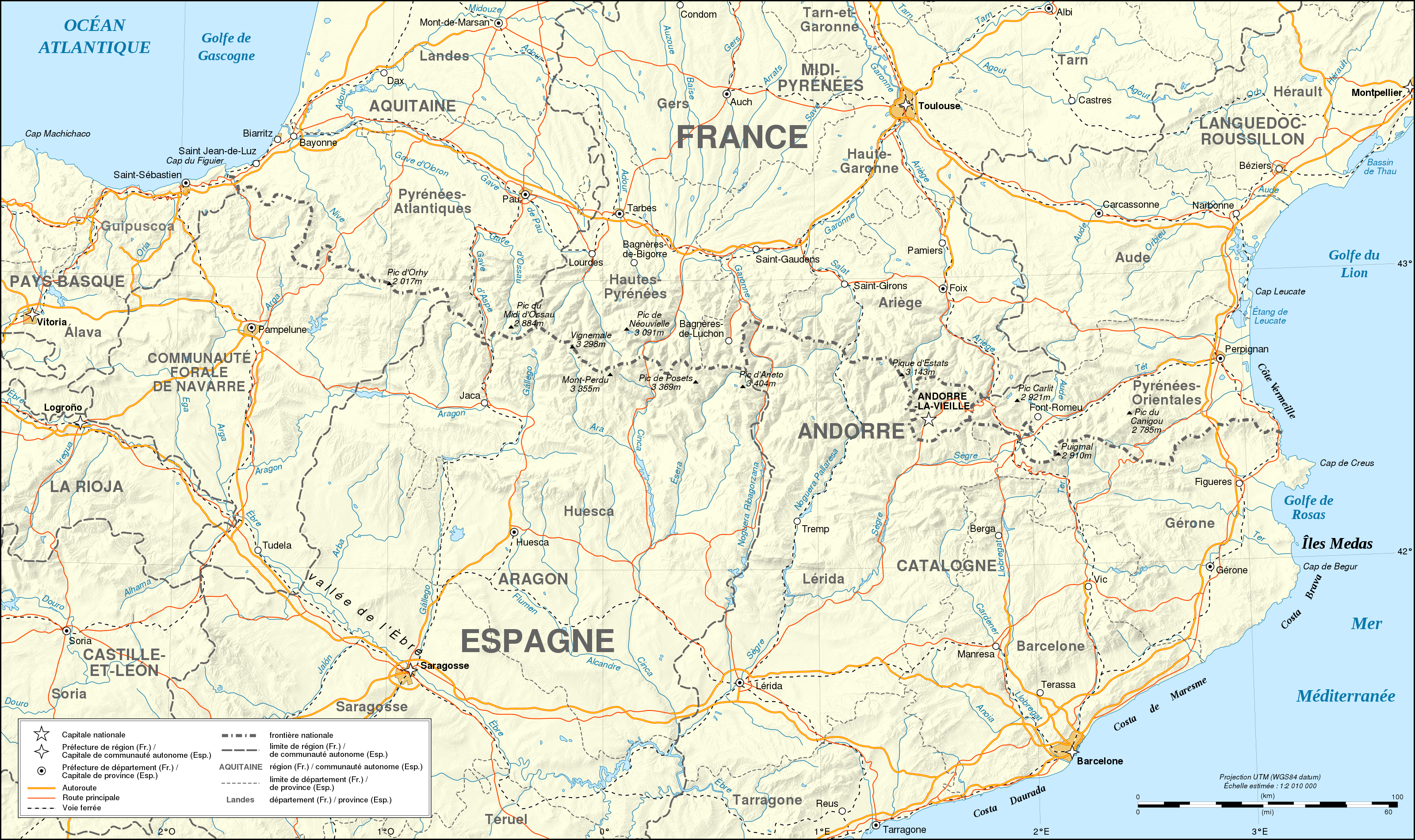 En Francia, la cadena montañosa de los Pirineos atraviesa dos regiones administrativas y seis departamentos, que son de este a oeste: Occitania (Pirineos Orientales, Aude, Arieja, Alto Garona y Altos Pirineos) y Nueva Aquitania (Pirineos Atlánticos). Del lado español, atraviesa cuatro comunidades autónomas y siete provincias de España: Cataluña (Girona, Barcelona y Lérida), Aragón (Huesca y Zaragoza), Navarra (comunidad compuesta por una sola provincia del mismo nombre) y País Vasco (Guipúzcoa).