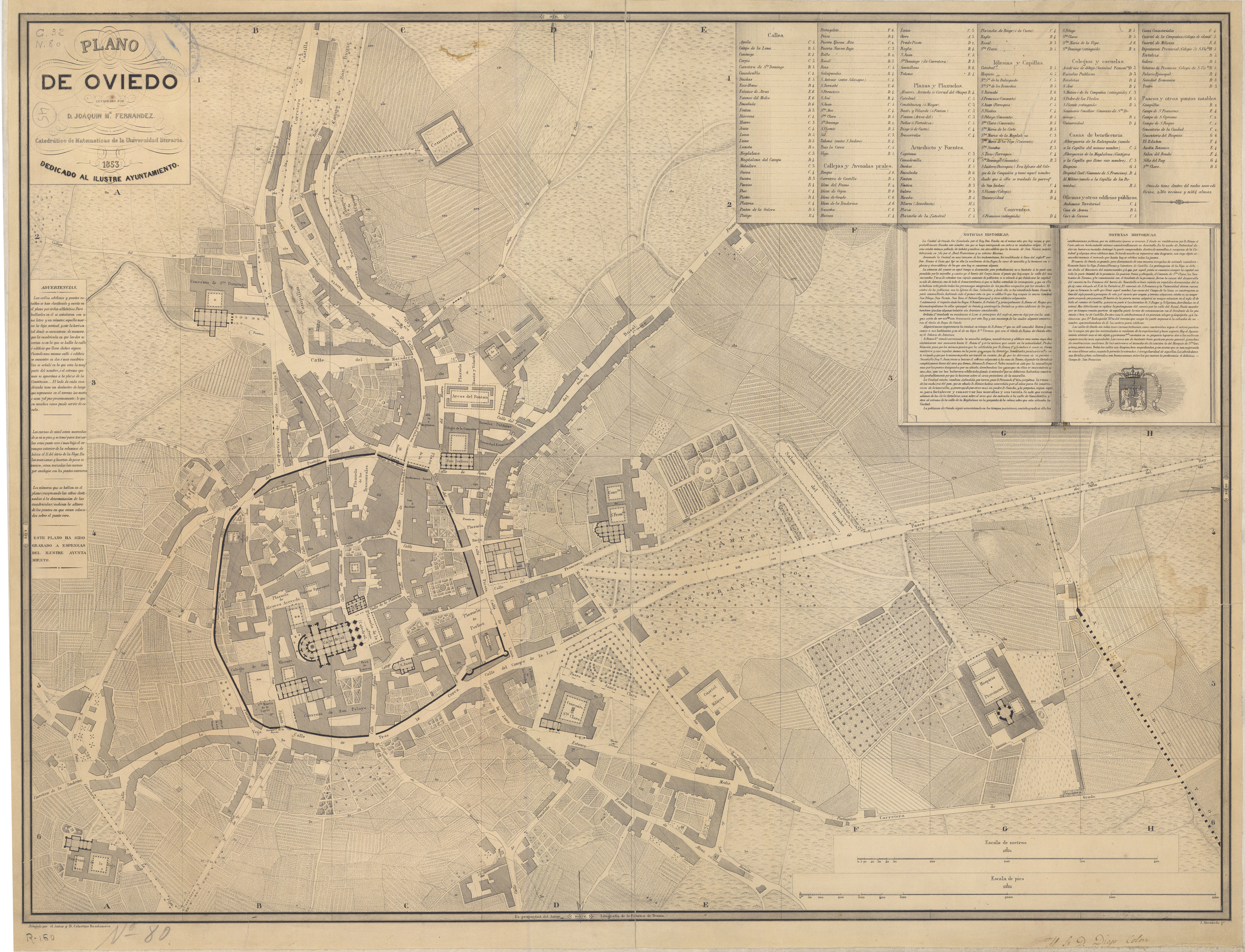 En 1853, Oviedo era una ciudad que conservaba su carácter medieval, con un trazado urbano compacto y una población de aproximadamente 19,610 habitantes . Ese año se elaboró un detallado plano de la ciudad, conocido como el «Plano de población de Oviedo», realizado por Joaquín María Fernández, catedrático de Matemáticas de la Universidad Literaria, junto con Celestino Brañanova y el grabador J. Abruñedo.