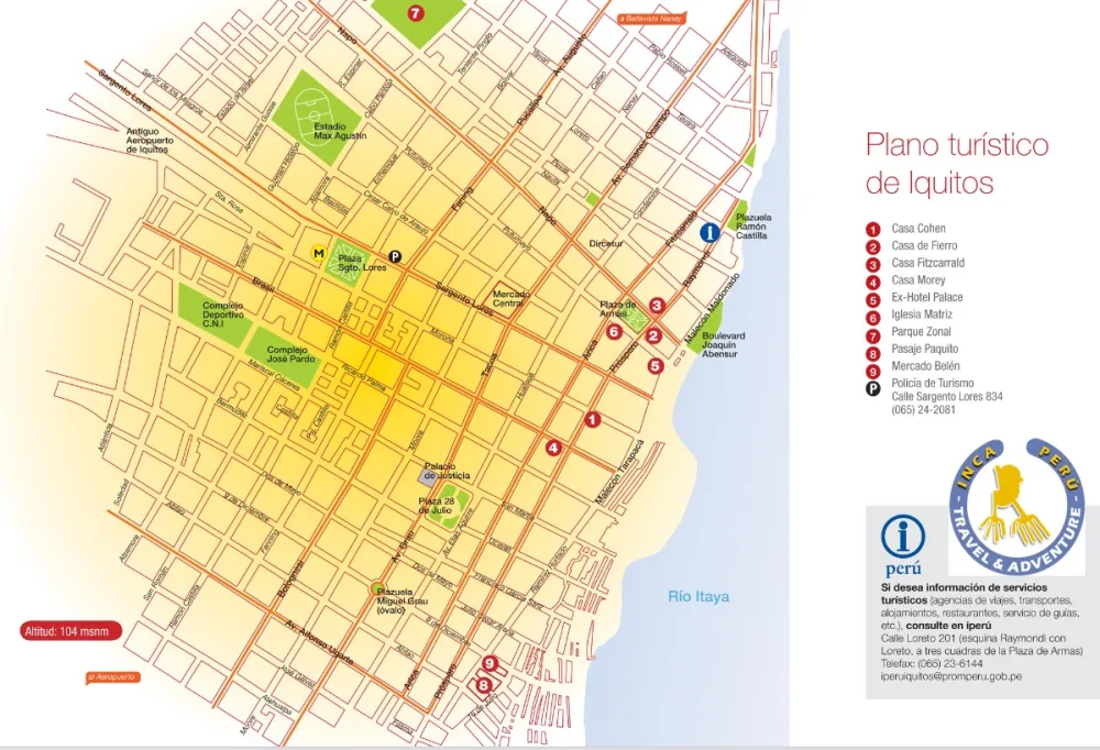 Mapa del centro de Iquitos, la parte más al este del distrito de Iquitos, y el centro de comercio, entretenimiento, turismo y negocio de la Ciudad de Iquitos. El Centro se define comúnmente como el área que delimita con el sur por el jirón Fitzcarrald, el este por el jirón Tacna, al norte del Barrio de Belén y al oeste por el río Itaya (parte del Puerto de Iquitos).