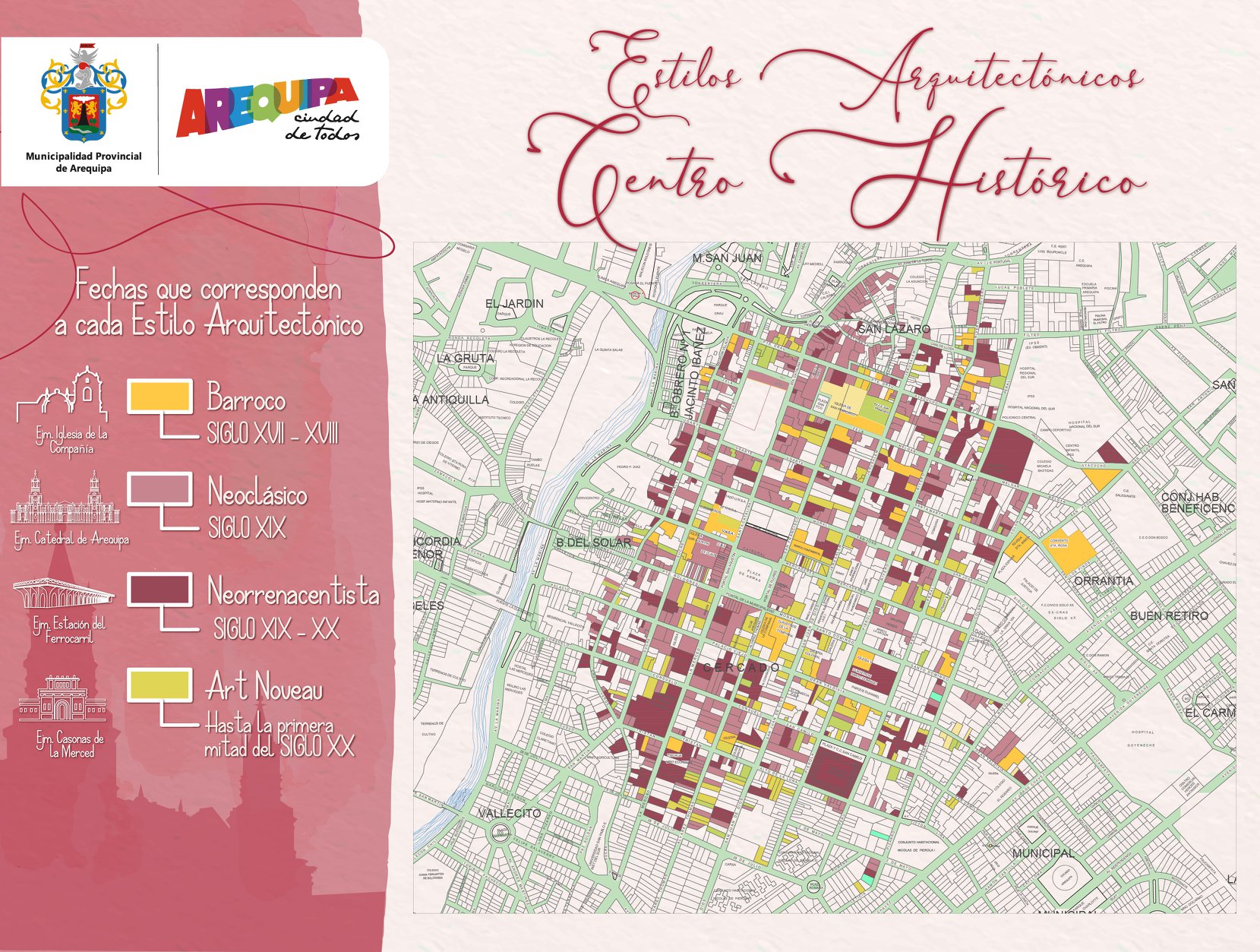 El Centro Histórico de Arequipa es el núcleo fundacional y la aglomeración de barrios con características propias que la circundan, se extiende sobre una superficie de 332 hectáreas y dentro de ella existen 5817 predios de los cuales 500 son categorizados como patrimonio, las edificaciones han sido construidas generalmente en el siglo XIX sobre el sitio de edificios coloniales anteriormente destruidos por el terremoto de 1868. Las casonas, generalmente hechas en sillar, se caracterizan por sus arcos semi-circulares y sus techos en bóveda. Las estructuras de sillar poseen siempre los muros gruesos: 1 a 1.5 metros para las habitaciones, más de 2 metros para las iglesias. Gracias a la utilización de mortero de cal, los muros se muestran homogéneos, imagen que se refuerza con las bóvedas de ladrillo o de sillar que se justifican en la rareza de la madera.