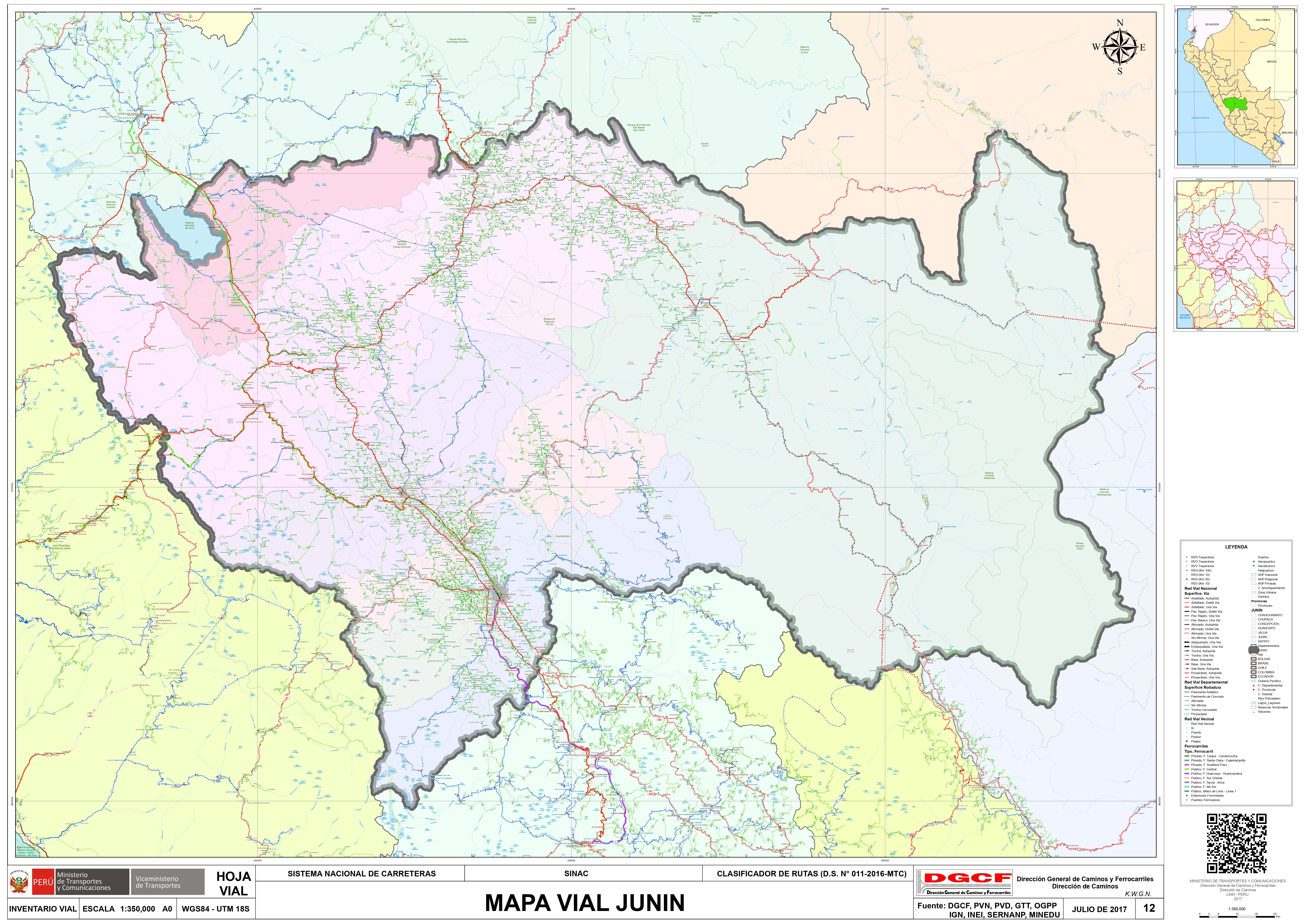La principal vía en Junín es la Carretera Central (parte de la IIRSA Centro), en el tramo que une Lima con la ciudad de La Oroya, donde se divide en dos; uno hacia el norte, conectando con los departamentos de Pasco y Huánuco, y otro, hacia el sur, uniendo a los departamentos de Huancavelica y Ayacucho. En la Carretera Central
