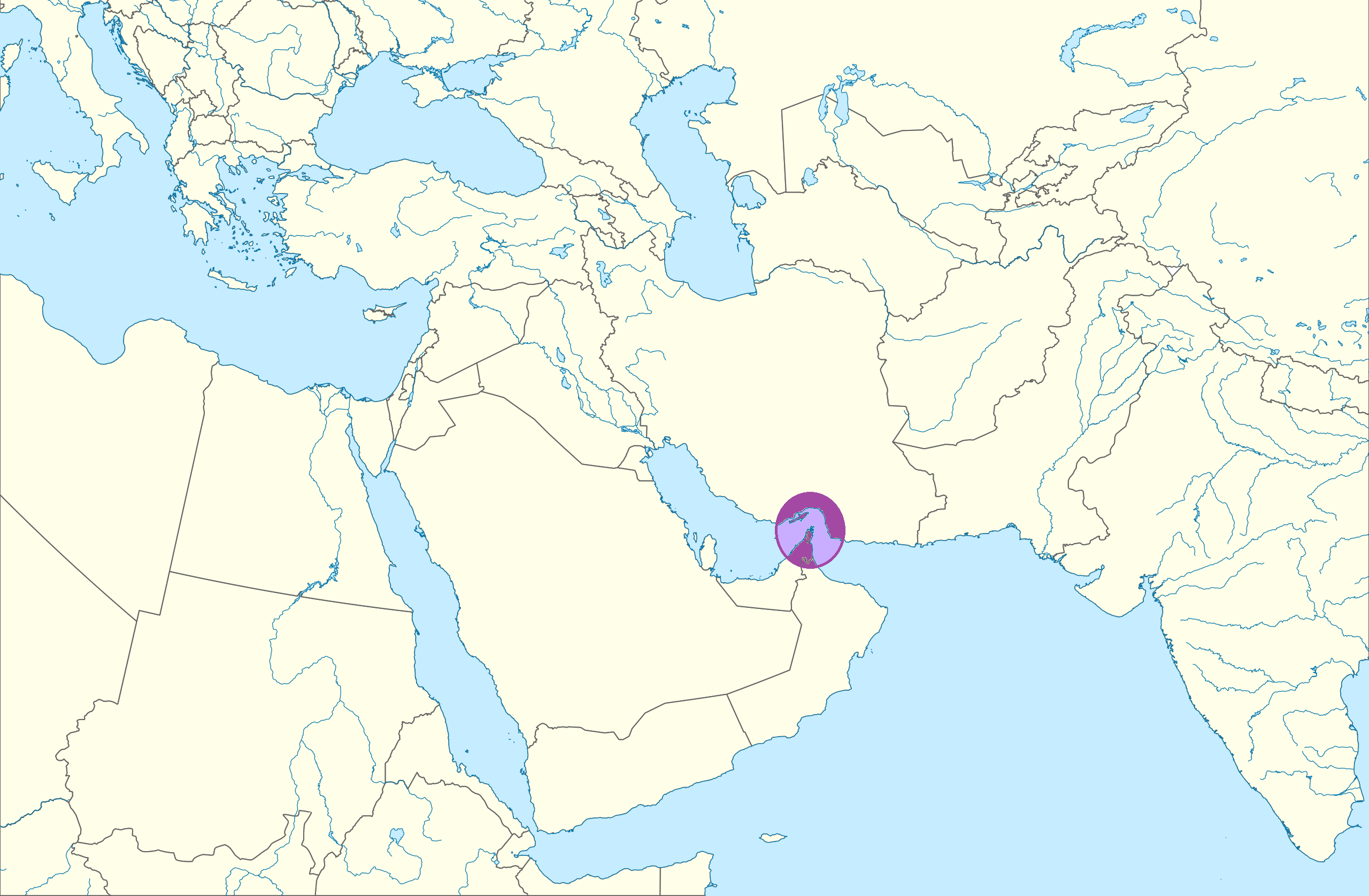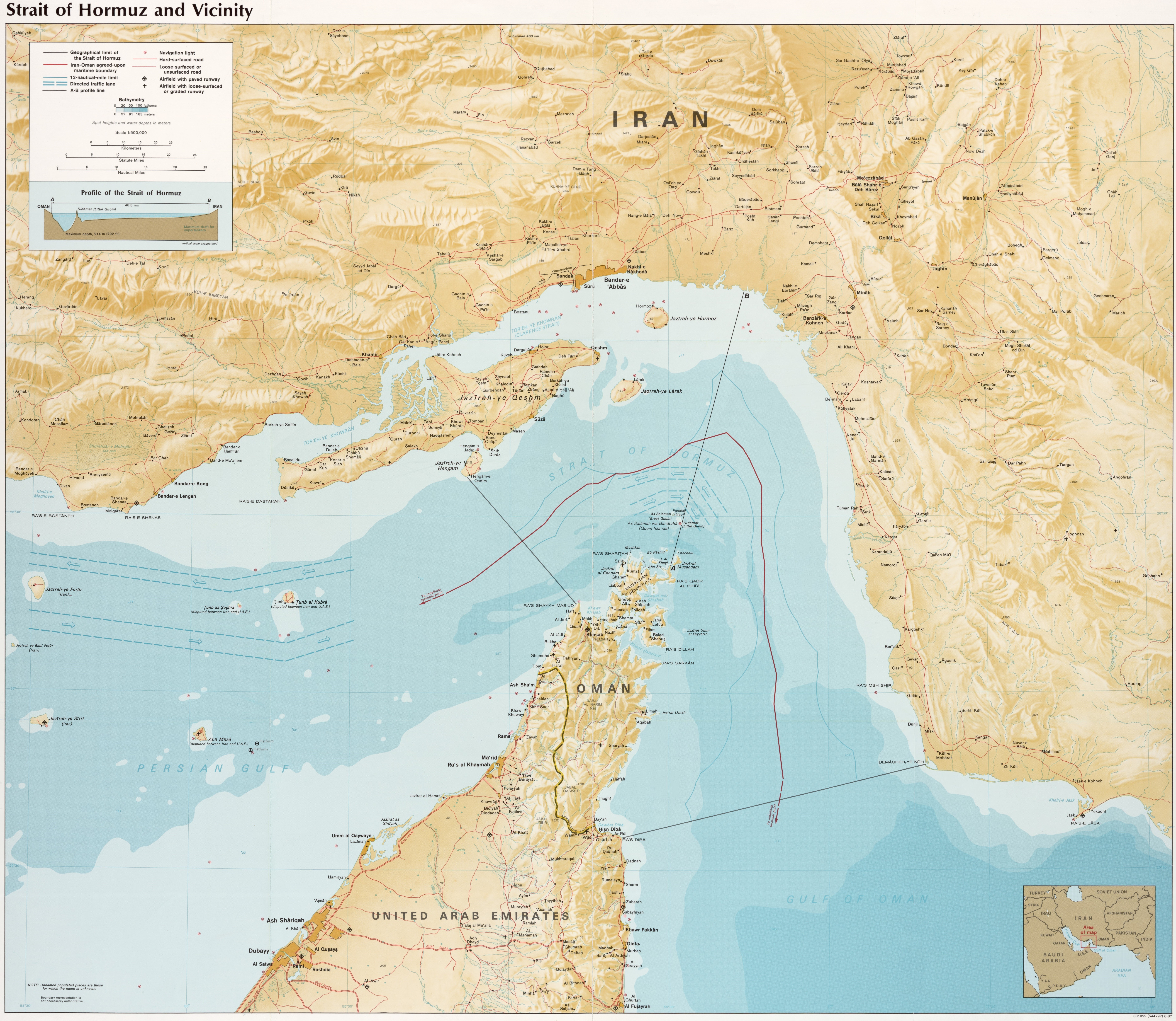 Ubicación: entre la península de Muscate y Omán (Omán) y la costa de Irán.