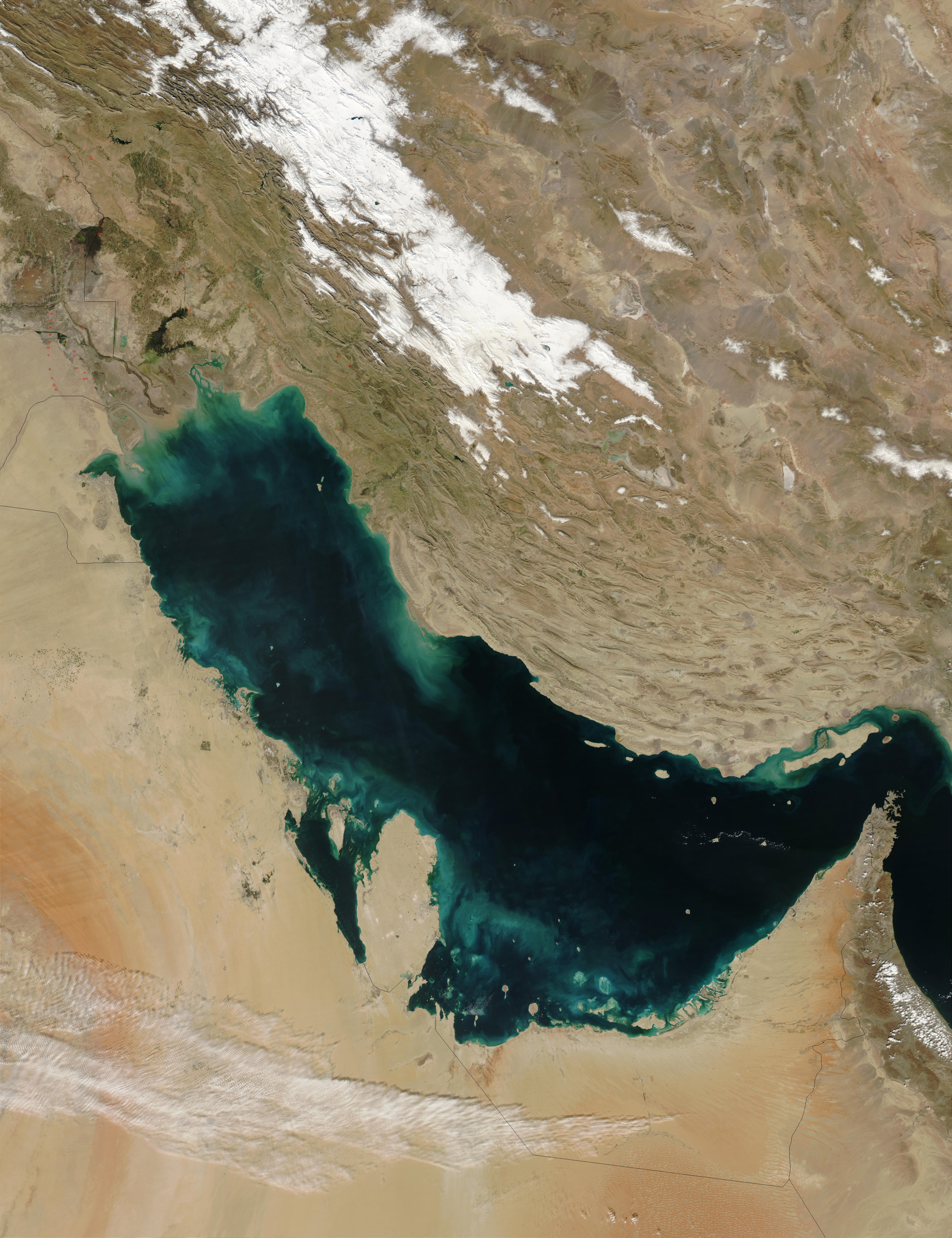 Oeste: se interna hacia el Shatt al-Arab, formado por la confluencia del Tigris y el Éufrates, en la frontera entre Irak e Irán.