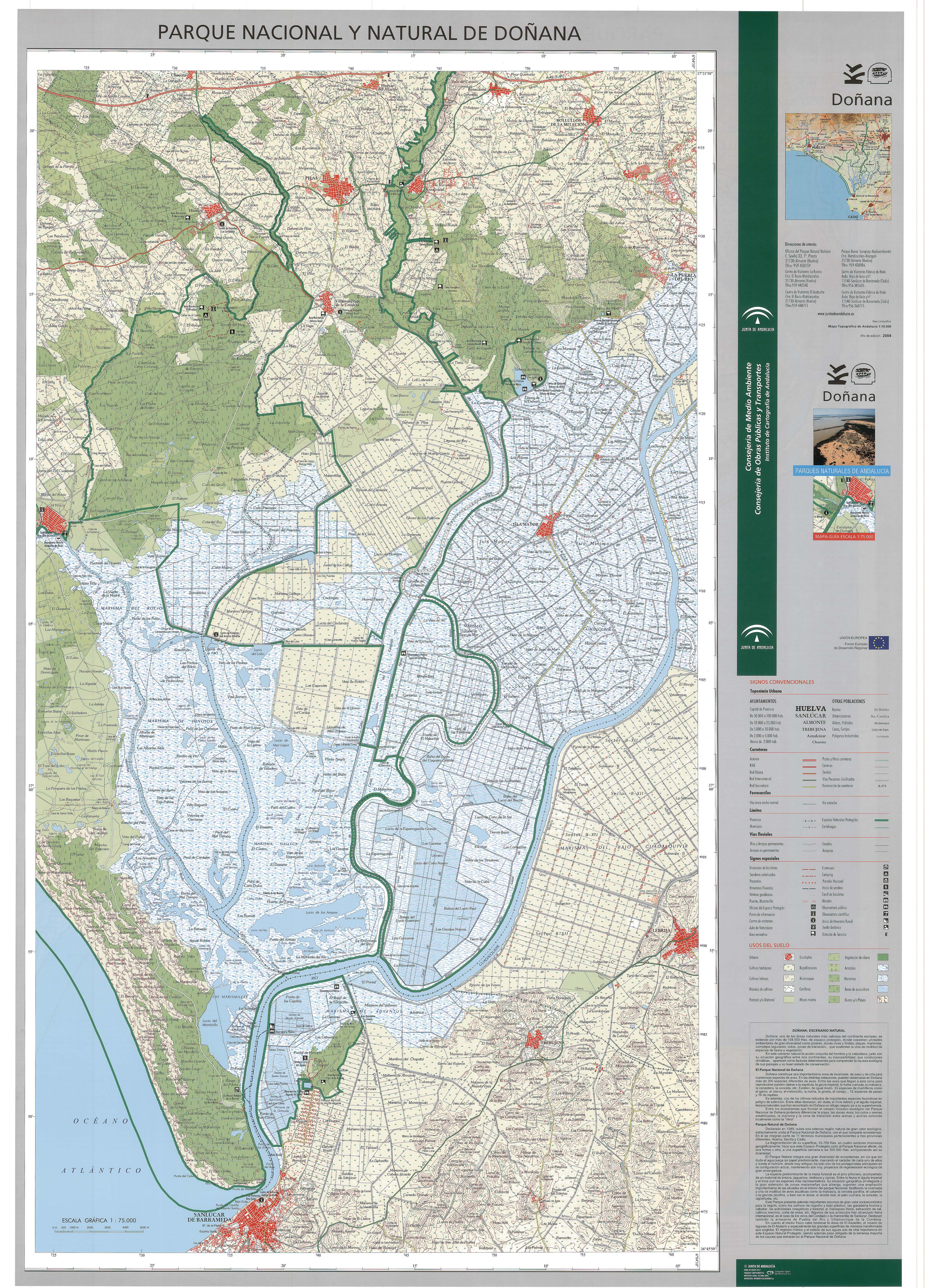 La reserva natural de Doñana comprende tanto el Parque Nacional de Doñana, establecido en 1969, como el Parque Natural, creado en 1989 y ampliado en 1997, creando una zona de protección bajo la gestión del gobierno regional. Ambos parques, nacional y natural, han sido clasificados desde entonces como un único paisaje natural. Debido a su situación estratégica entre los continentes europeo y africano y a su proximidad al Estrecho de Gibraltar, la gran extensión de marisma de Doñana es zona de cría y punto de tránsito de miles de aves europeas y africanas (acuáticas y terrestres), y alberga numerosas especies de aves acuáticas migratorias durante el invierno, normalmente hasta 200.000 individuos. Se pueden avistar más de 300 especies diferentes de aves anualmente. Considerada la reserva natural más grande de Europa, diversas instituciones científicas cuentan con estaciones de monitoreo dentro de sus límites para garantizar el desarrollo adecuado de las tierras adyacentes y la conservación de las especies amenazadas que la habitan. La zona fue declarada Patrimonio de la Humanidad por la UNESCO en 1994; en 2006, el parque registró 376.287 visitantes.