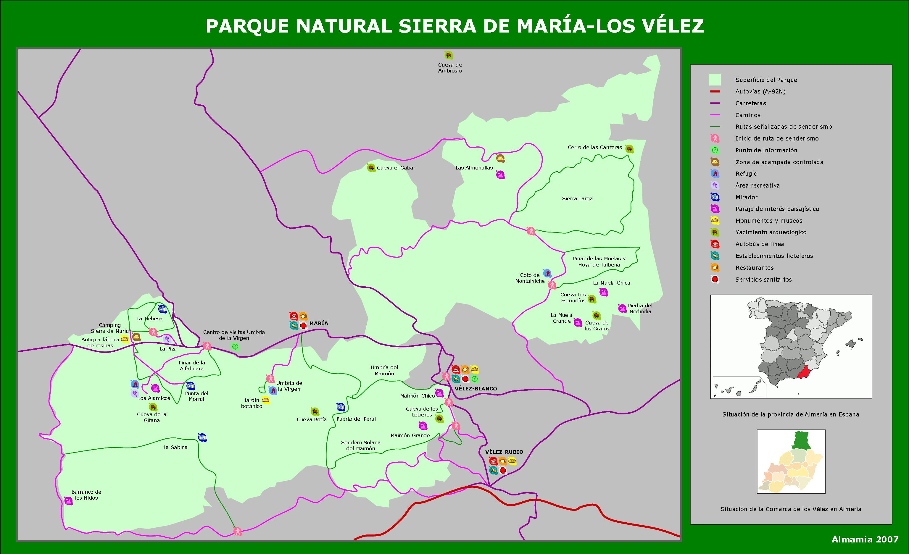 El Parque Natural de la Sierra de María-Los Vélez es un espacio natural protegido español situado en la provincia de Almería, Andalucía, que fue declarado parque natural en 1987, con una superficie de 22 562 hectáreas y una altura máxima de 2045 msm. Se extiende por los términos municipales de los municipios de Chirivel, María, Vélez-Blanco y Vélez-Rubio. Se accede desde la autovía A-92-N, con salidas en Chirivel y Vélez Rubio. Dispone de oficina de información en el “Almacén de Trigo”, en Vélez-Blanco (centro de visitantes).