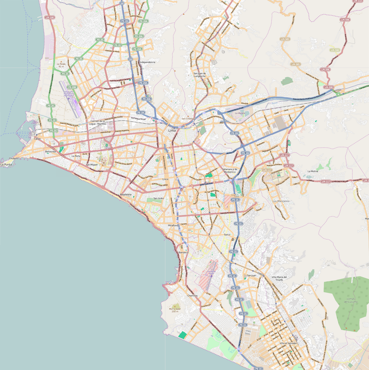 Mapa del Perú, oficialmente la República del Perú, un país en el oeste de América del Sur. Limita al norte con Ecuador y Colombia, al este con Brasil, al sureste con Bolivia, al sur con Chile y al sur y al oeste con el Océano Pacífico. Perú es un país megadiverso con hábitats que van desde las áridas llanuras de la región costera del Pacífico en el oeste hasta los picos de las montañas de los Andes que se extienden desde el norte hasta el sureste del país hasta la selva tropical de la cuenca del Amazonas en el este con el río Amazonas. Perú tiene una población de 32 millones, y su capital y ciudad más grande es Lima. Con 1,28 millones de km², Perú es el decimonoveno país más grande del mundo y el tercero más grande de América del Sur.