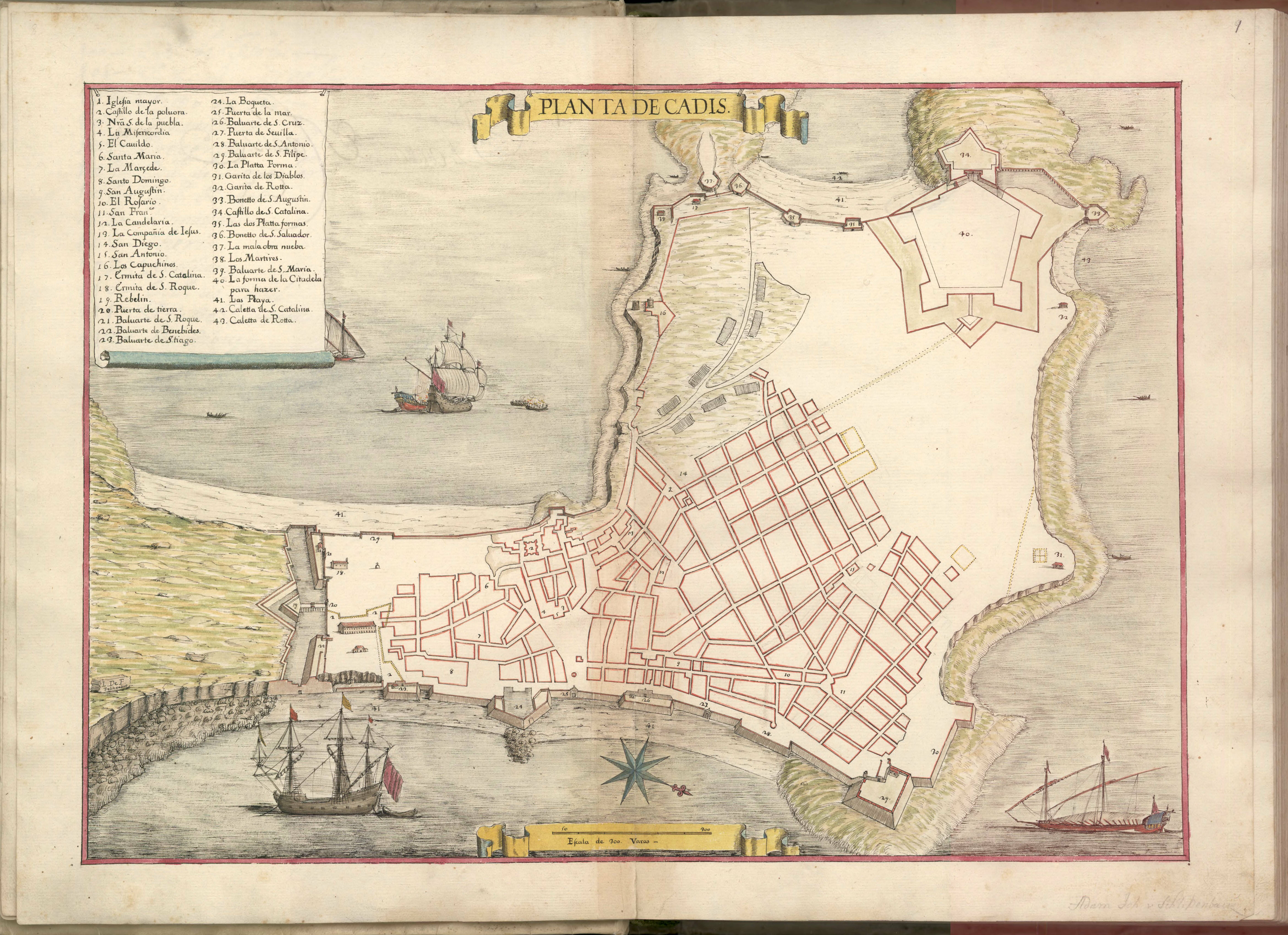 Mapa dibujado a mano del siglo XVII de Cádiz, España