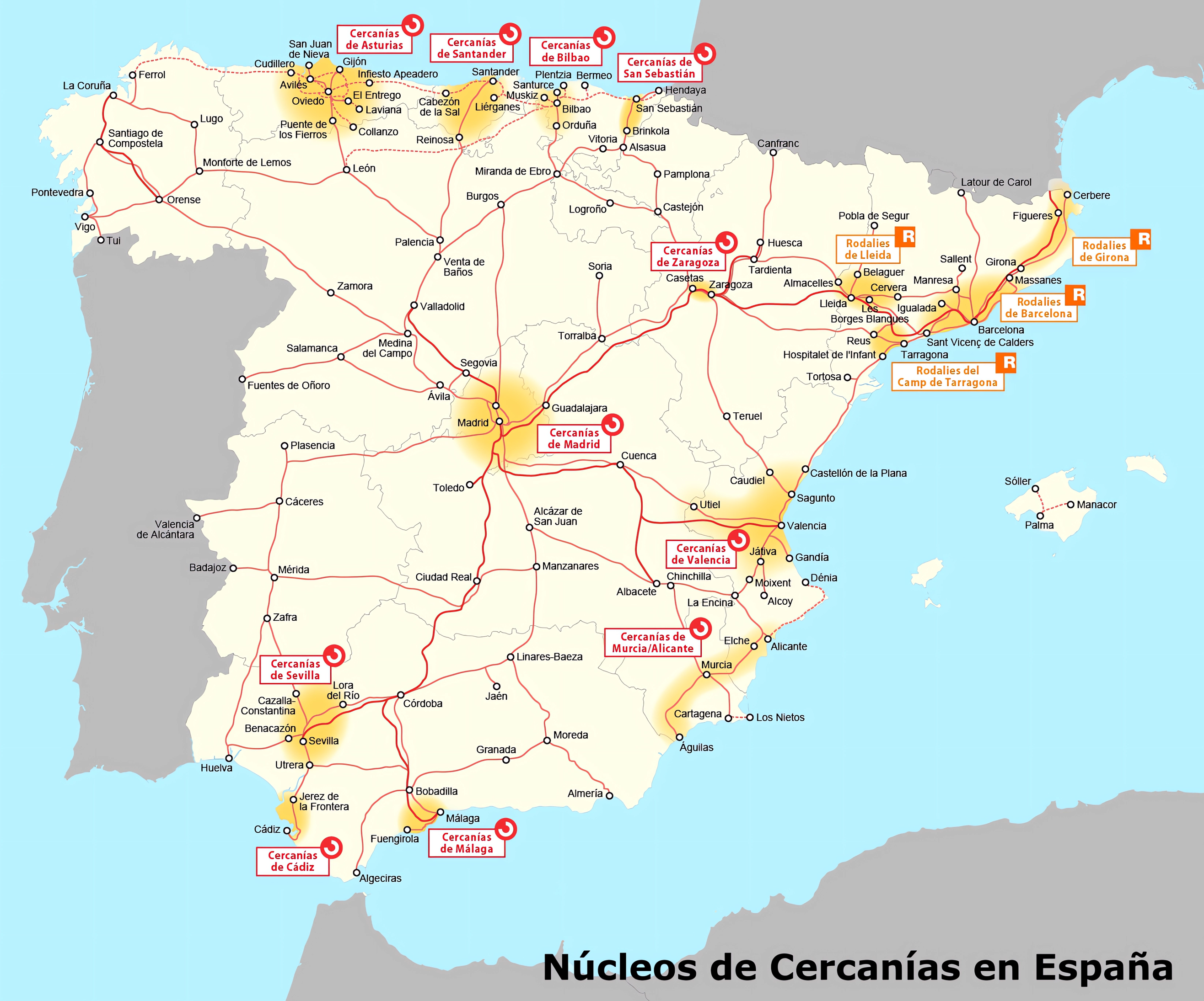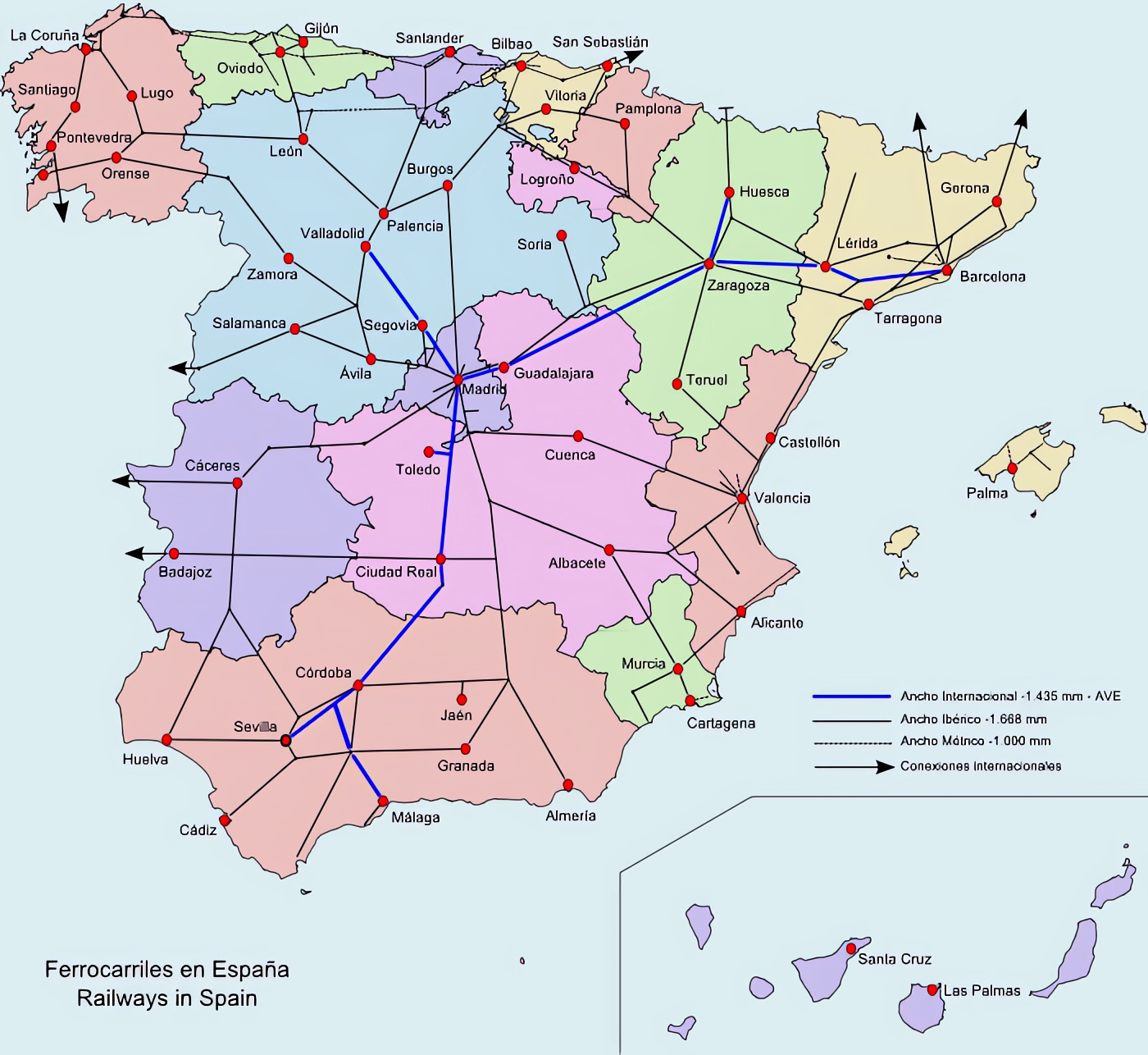 La mayor parte de los ferrocarriles son explotados por Renfe; las líneas de vía estrecha son explotadas por FEVE y otros transportistas en las distintas comunidades autónomas. Se propone construir o convertir más líneas de ancho de vía estándar, especialmente cuando estas líneas se conectan con países adyacentes.