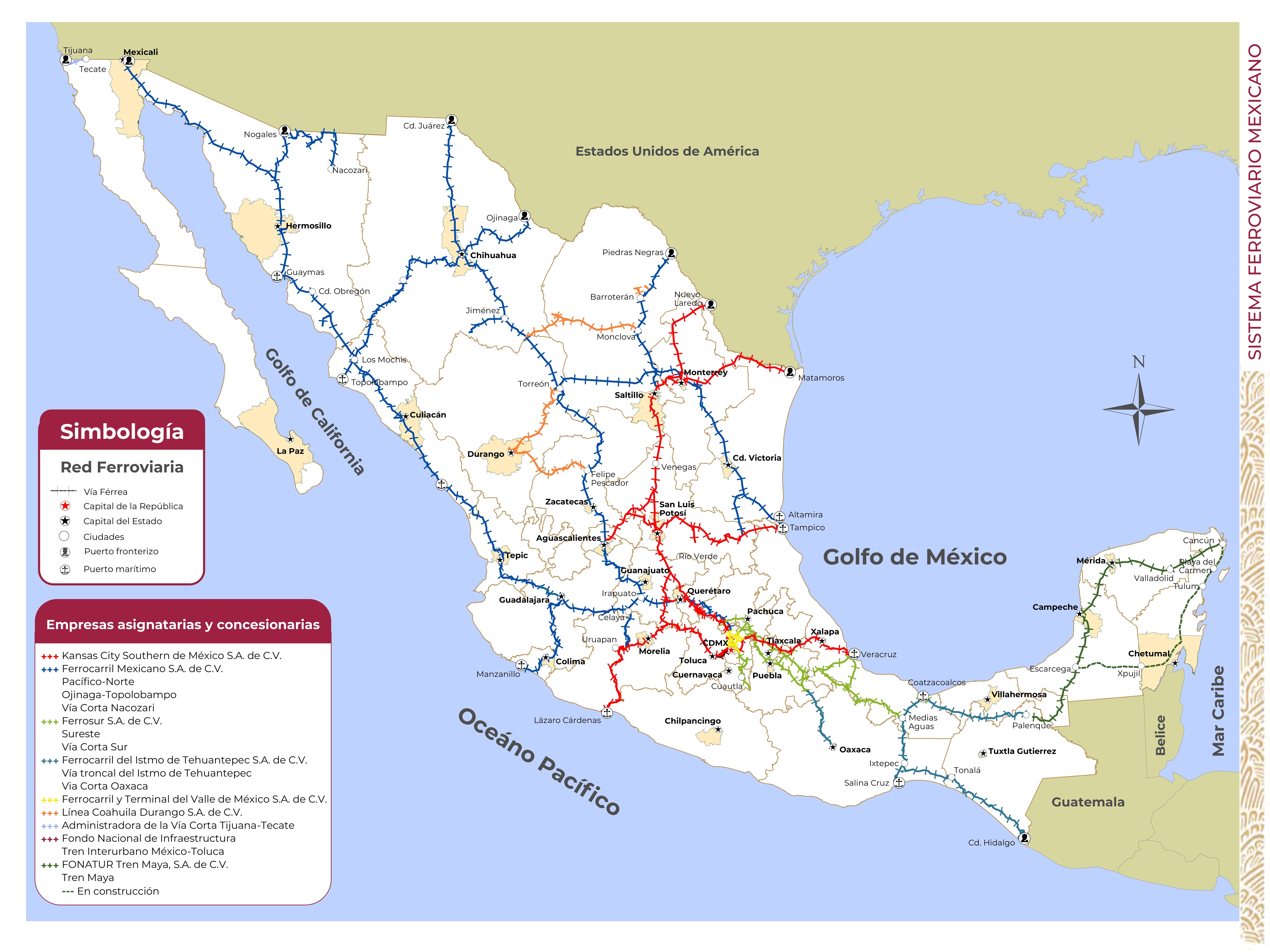 Con Estados Unidos: más de 10 cruces ferroviarios (Ciudad Juárez–El Paso, Nuevo Laredo–Laredo, Piedras Negras–Eagle Pass, Mexicali–Calexico, entre otros).