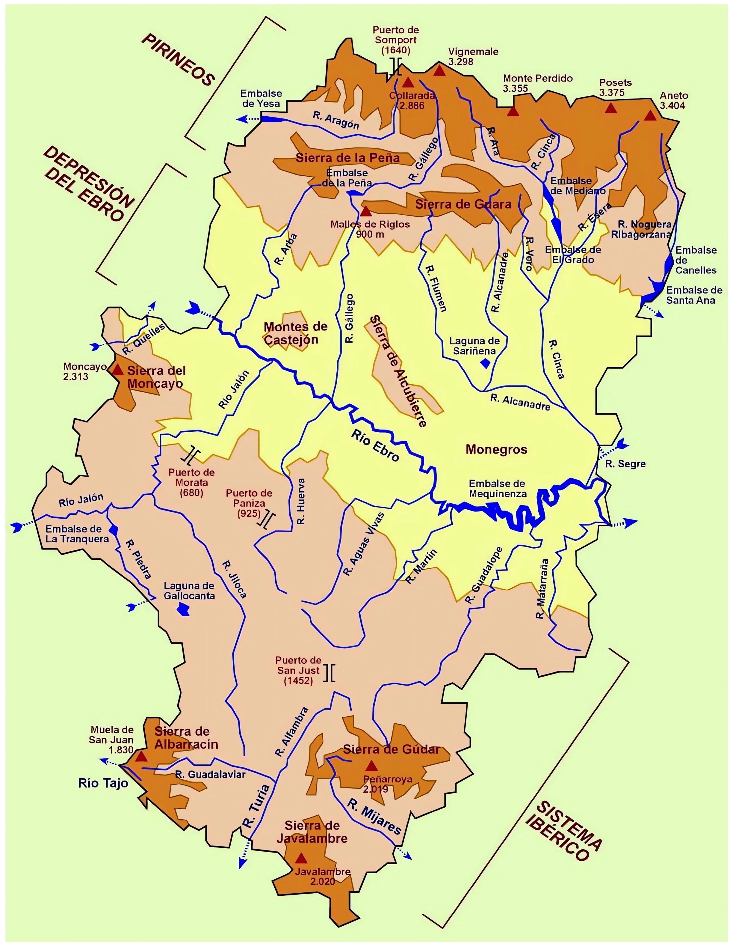 El Sistema Ibérico aragonés se divide entre las provincias de Zaragoza y de Teruel. Es un conjunto de sierras sin unidad estructural clara, que puede dividirse en dos zonas: Sistema Ibérico del Jalón y Sistema Ibérico turolense. En el primero destaca el Moncayo con 2314 m s. n. m., formado por cuarcitas y pizarras paleozoicas, en parte recubiertas por calizas mesozoicas; al sureste del Moncayo el Sistema Ibérico desciende de altura. El segundo está formado por terrenos elevados (de 1000 a 2000 m s. n. m. por lo general), pero aplanados y macizos. Al suroeste de la depresión se alcanzan las cumbres de la sierra de Albarracín por encima de los 1800 m s. n. m., al sureste se superan los 2000 m s. n. m. en la sierra de Javalambre y por último se llega a la sierra de Gúdar (2024 m s. n. m.) de transición al Maestrazgo.