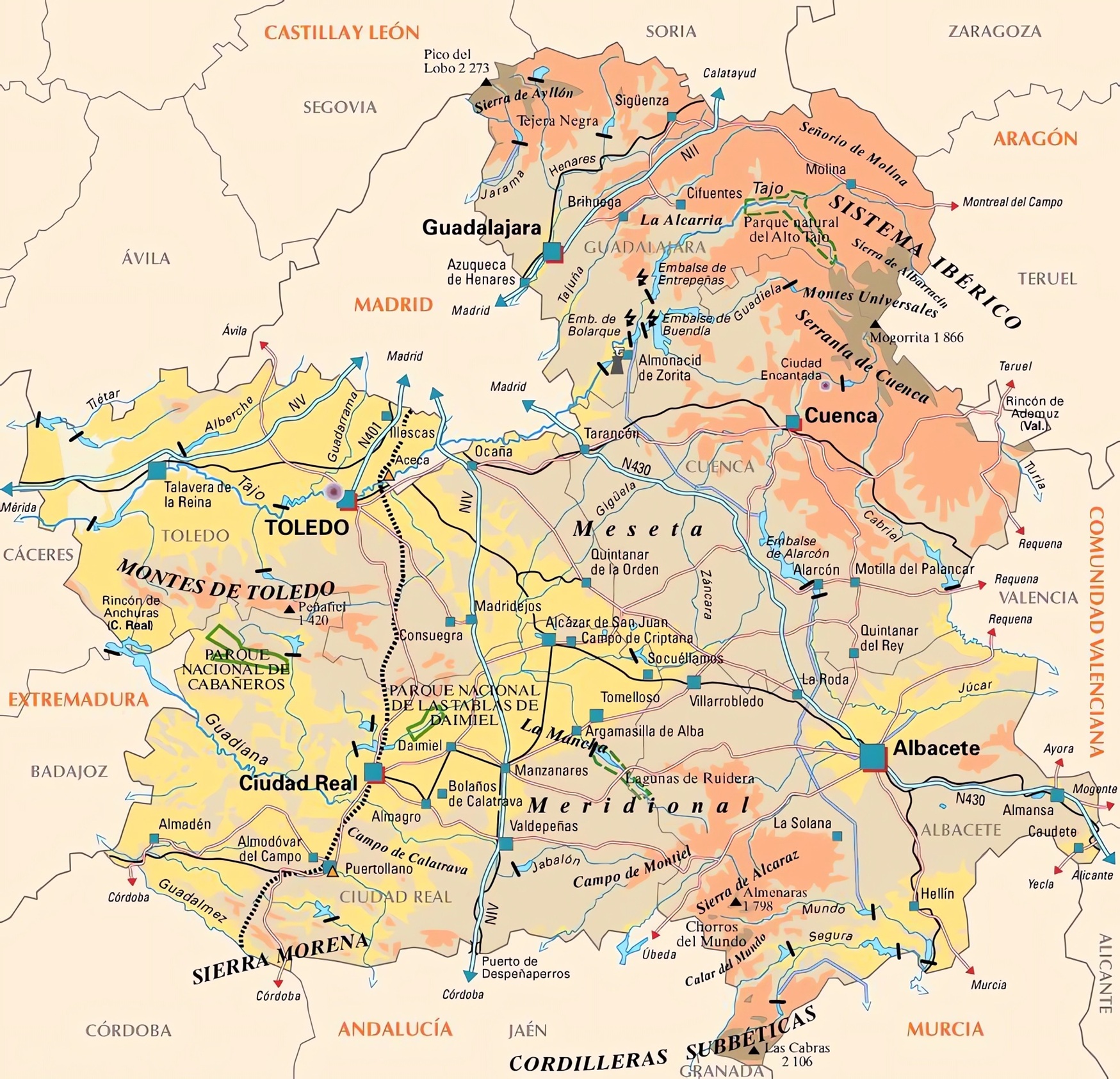La zona estesureste, perteneciente al sistema Ibérico. En la parte noroeste se extienden las montañas de Zamora, con picos amesetados por la erosión. Al este, en las montañas sorianas, se puede apreciar el sistema Ibérico, presidido por el Moncayo, su cumbre más alta. Separando la Meseta septentrional de la meridional, al sur, se levanta el sistema Central, donde se encuentran las sierras de Gata, Francia, Béjar y Gredos en la mitad oeste y las de Ávila, Guadarrama, Somosierra y Ayllón en la mitad este.