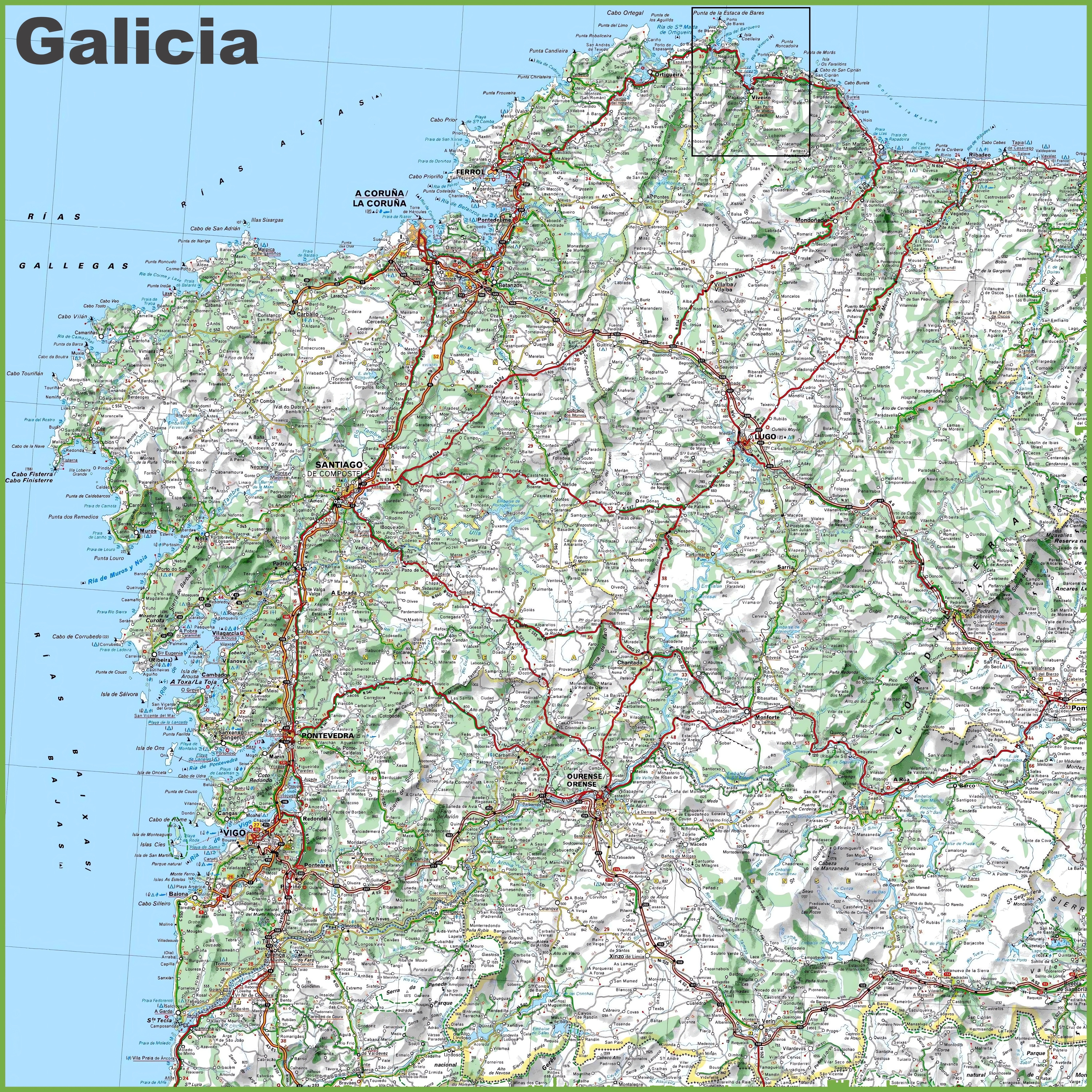 En la geografía gallega destaca el contraste entre el relieve costero y el del interior, más elevado que el primero. También contrasta la morfología entre las llanuras elevadas septentrionales y las sierras y depresiones meridionales.
