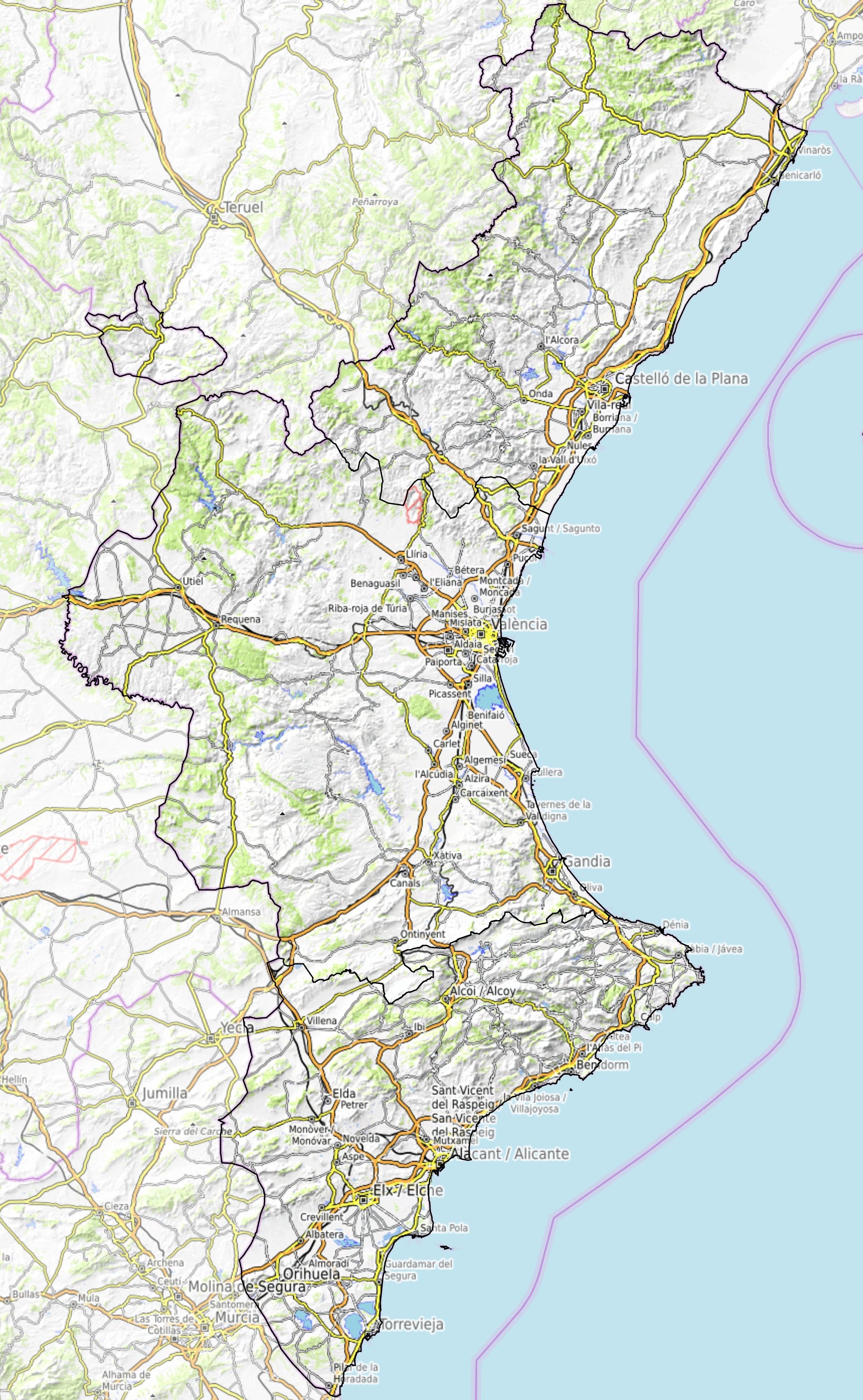 El interior del territorio es escarpado, con algunos de los picos más altos de las provincias de Valencia y Castellón formando parte de la Cordillera Ibérica. Las montañas de la provincia de Alicante, a su vez, forman parte de la Cordillera Subbética.