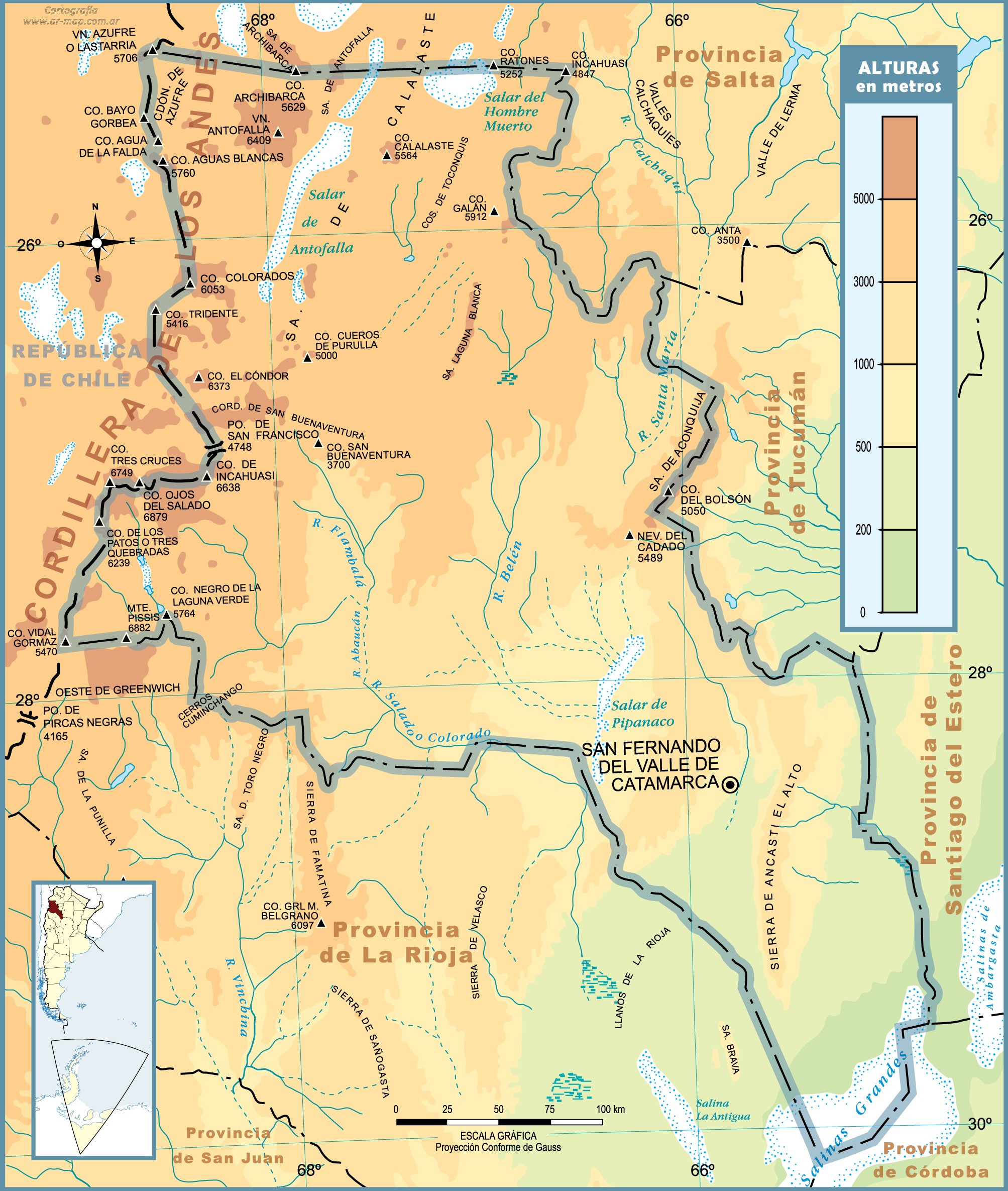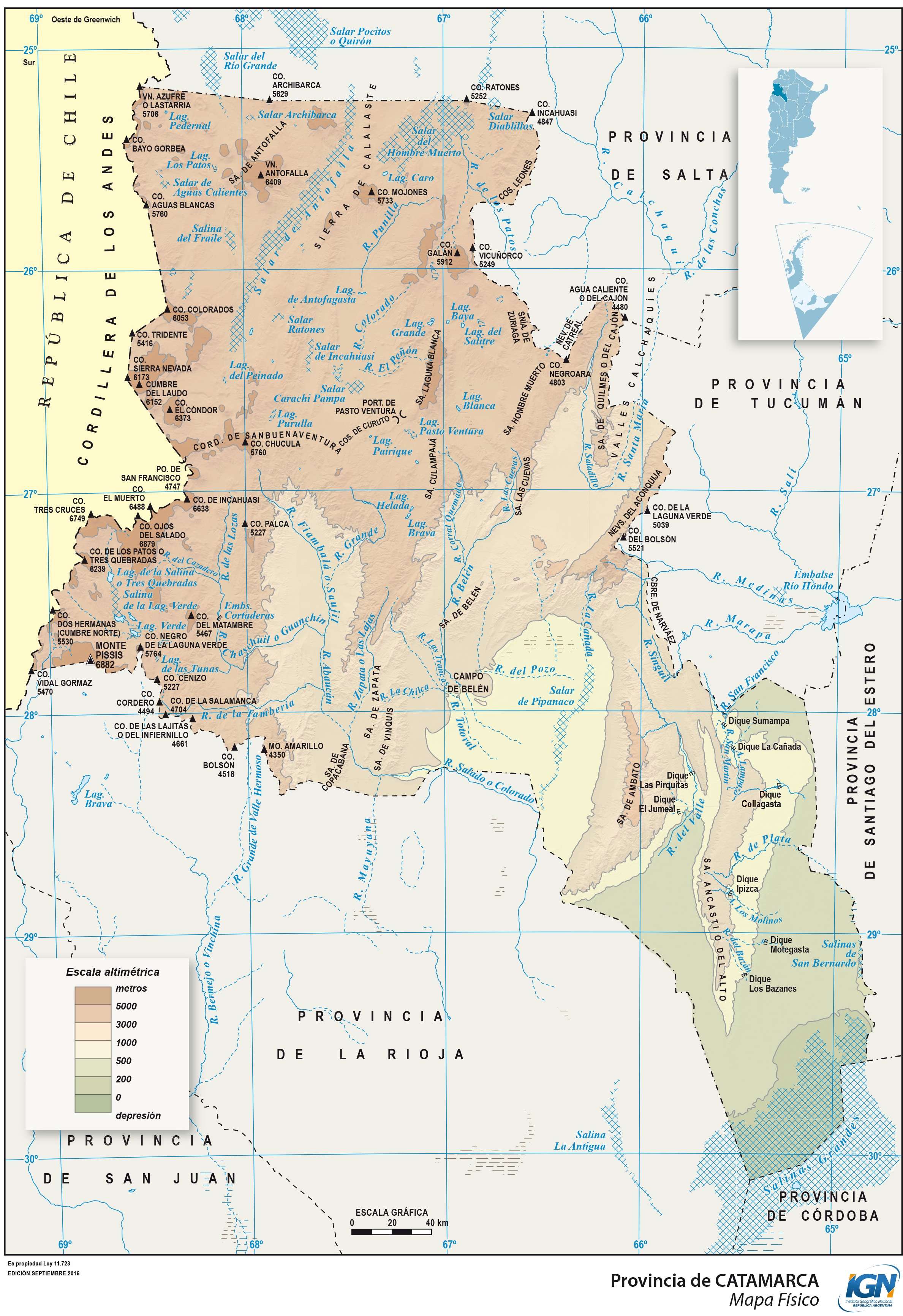 La geografía física catamarqueña se caracteriza por fuertes contrastes entre cordillera, puna, sierras y valles fértiles, en un ambiente mayormente seco y montañoso.