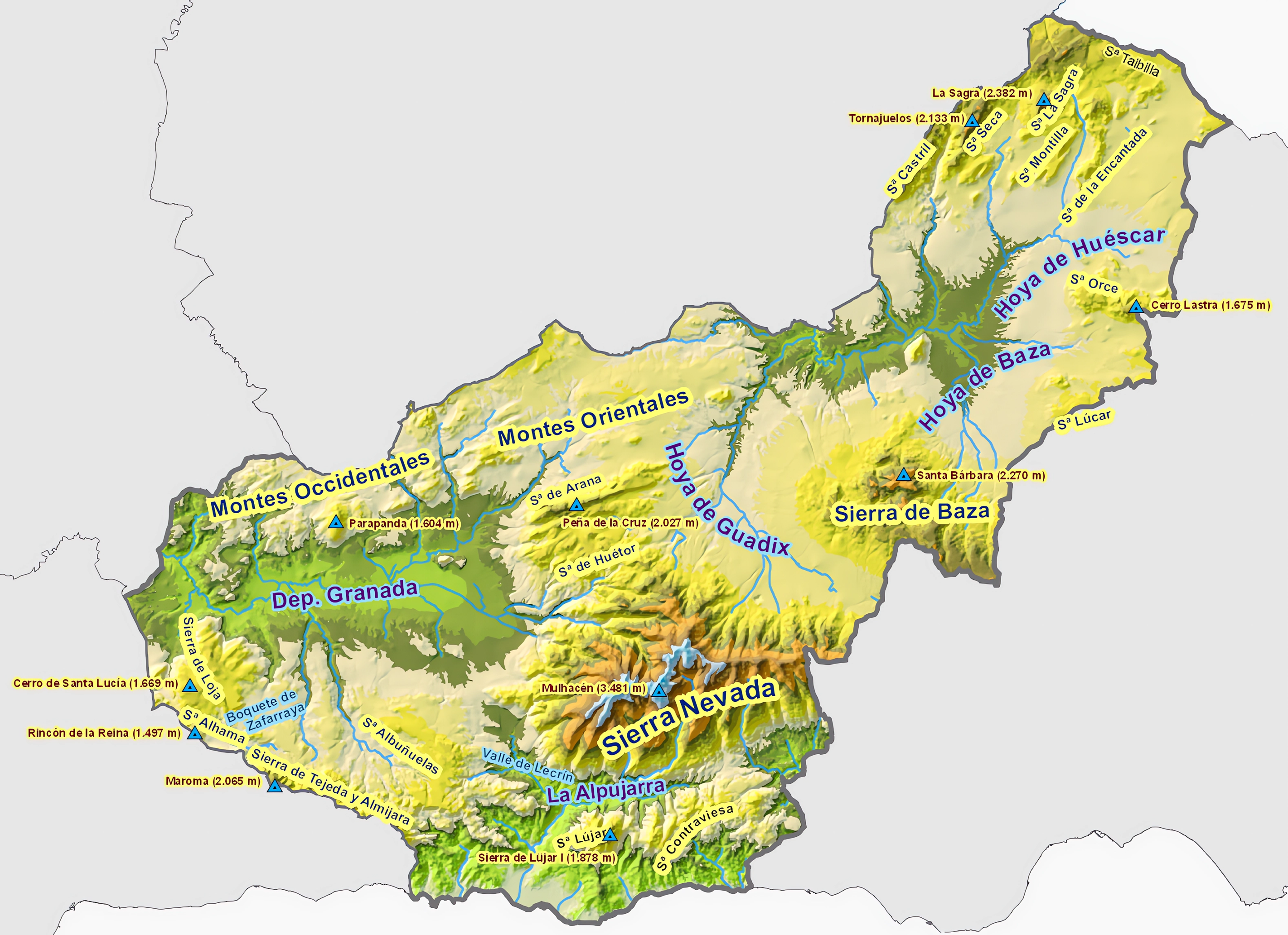 Granada comparte el Parque Nacional de Sierra Nevada (en la cordillera de Sierra Nevada) con la provincia de Almería. Otra sierra importante es la Sierra de Baza.